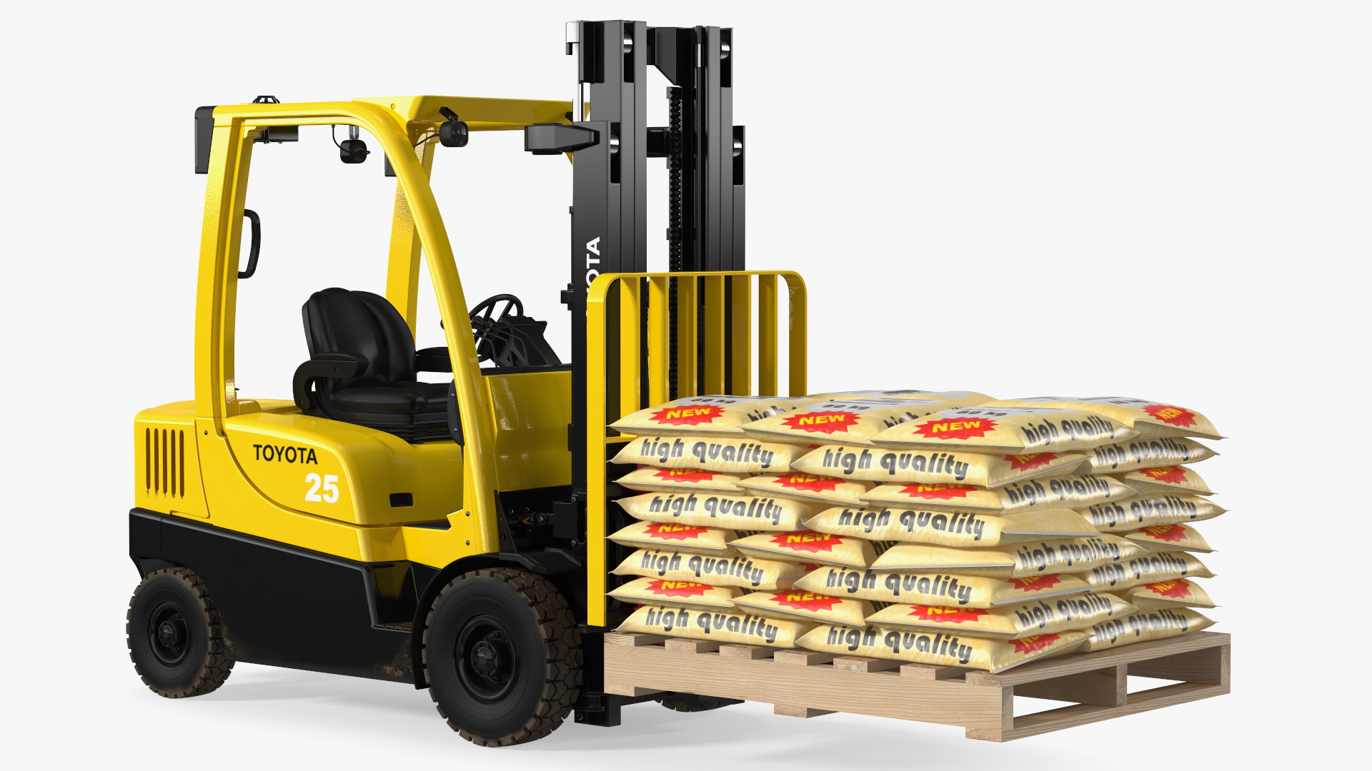 Forklift Toyota with Pallet of Cement Bags is a three-dimensional model of a widespread loading machine which is popular forklift loader.