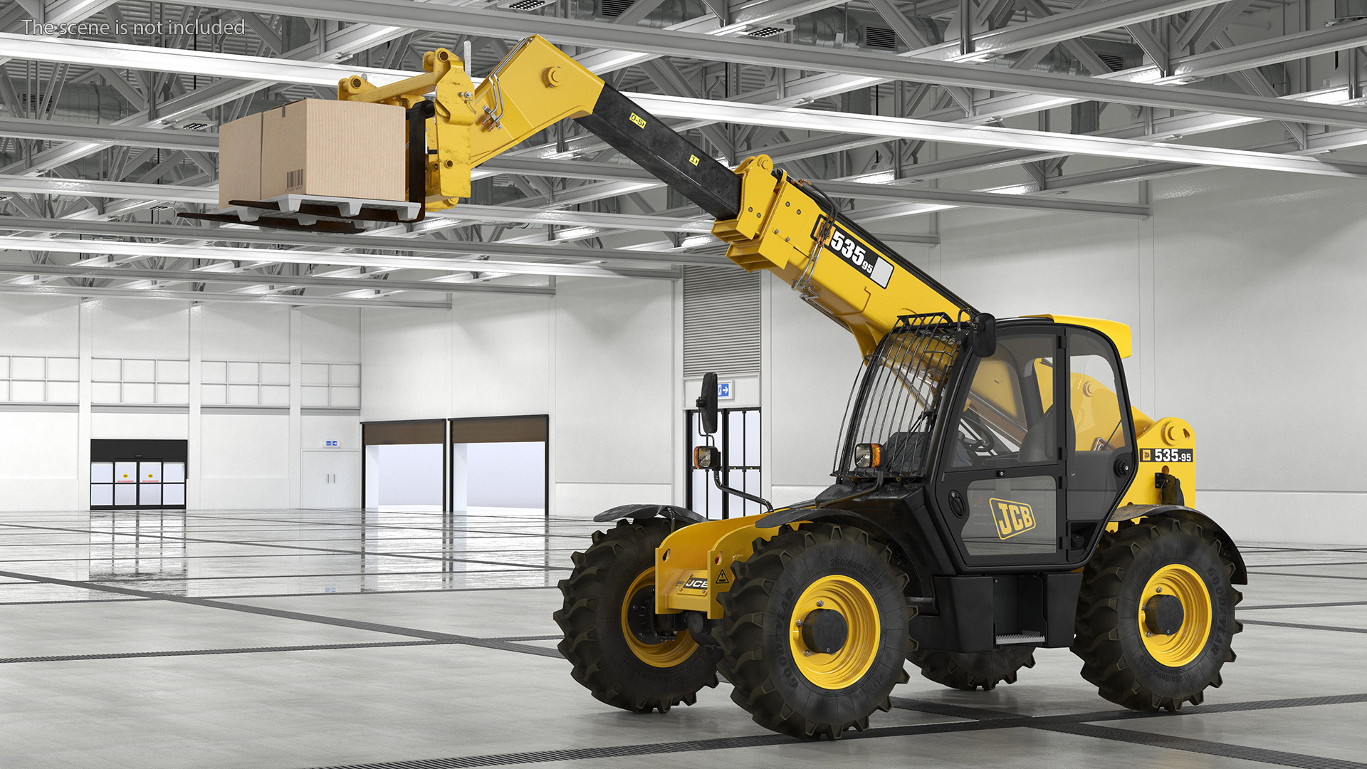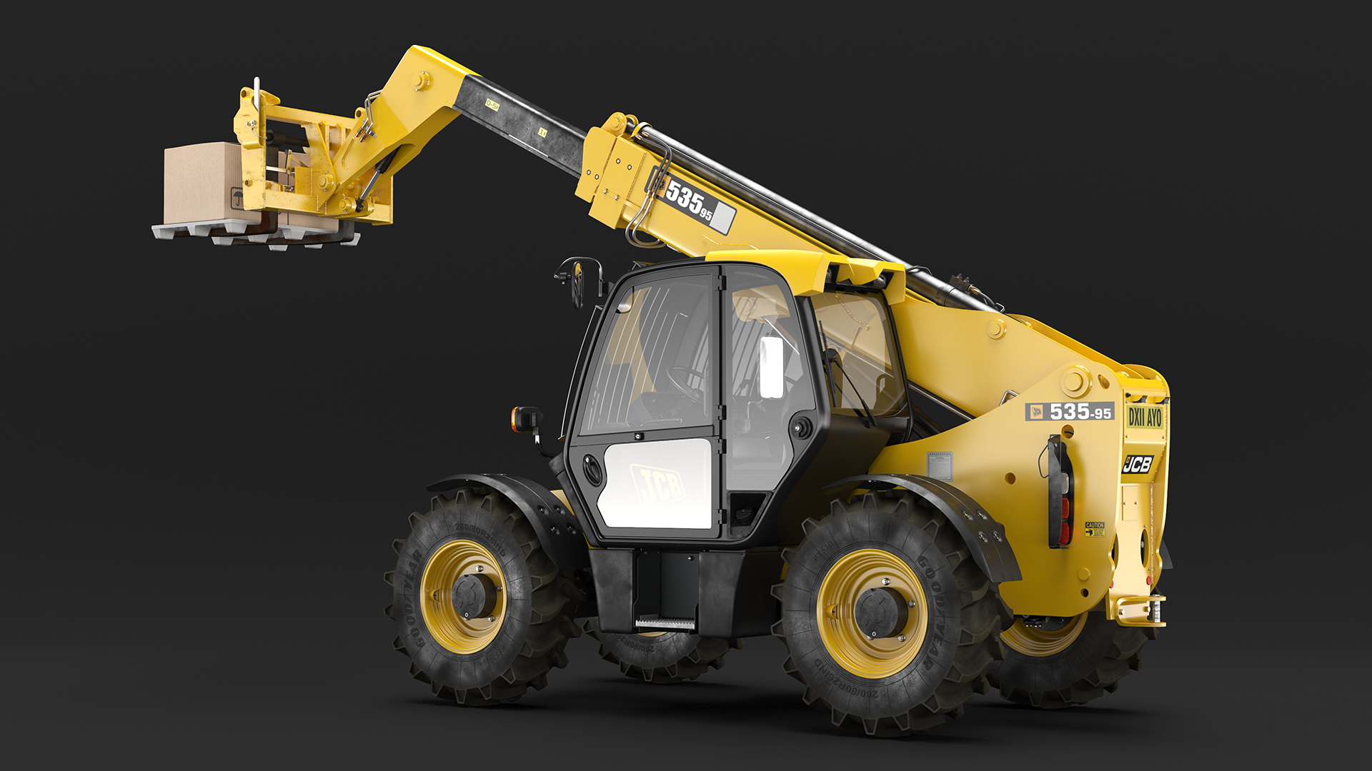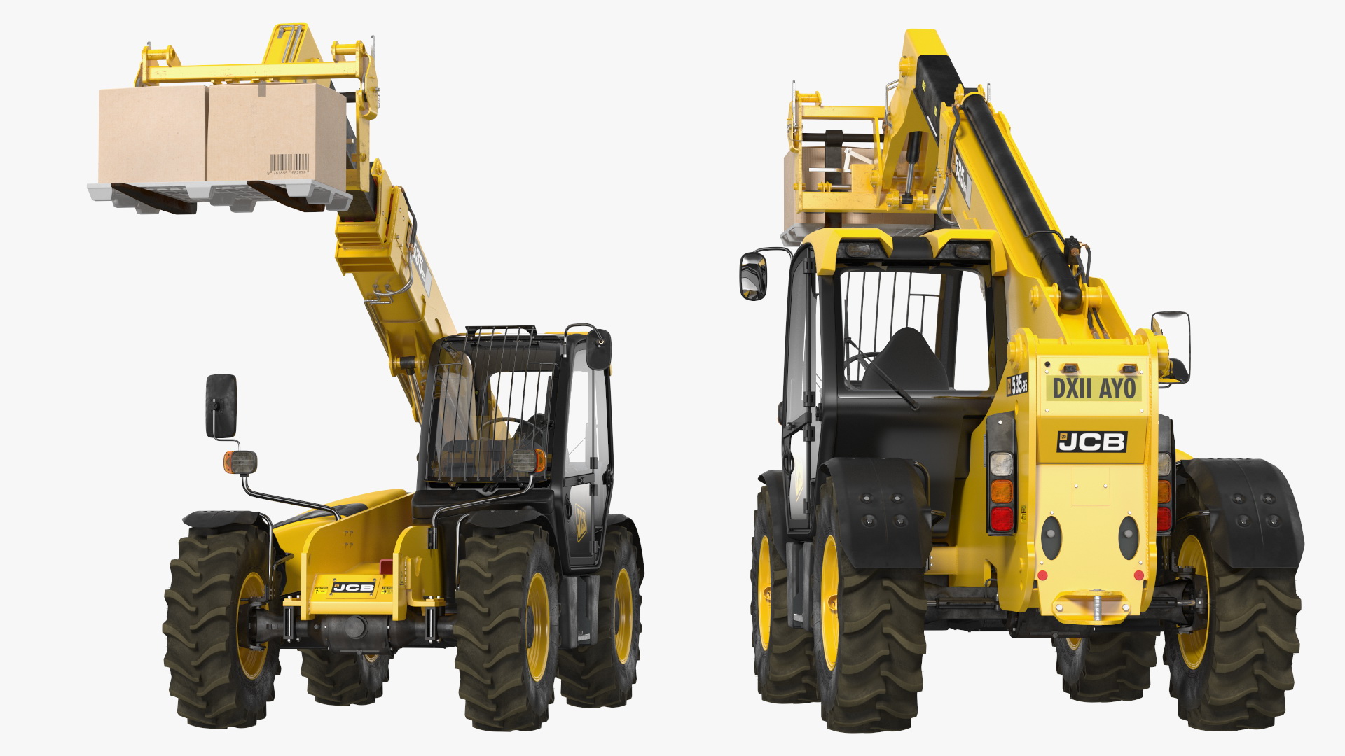 Forklift Truck JCB 535 with Pallet and Boxes is a three-dimensional model of fork-lift type, material handling equipment which can be used in agriculture, building works, construction, and other industries to lift and move heavy loads.