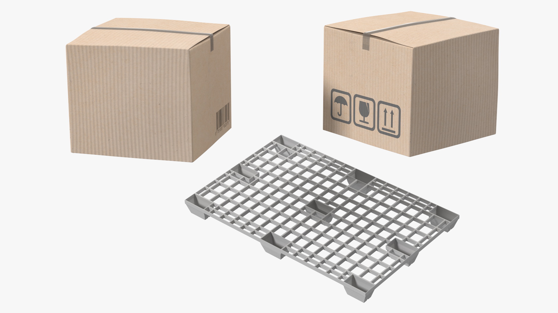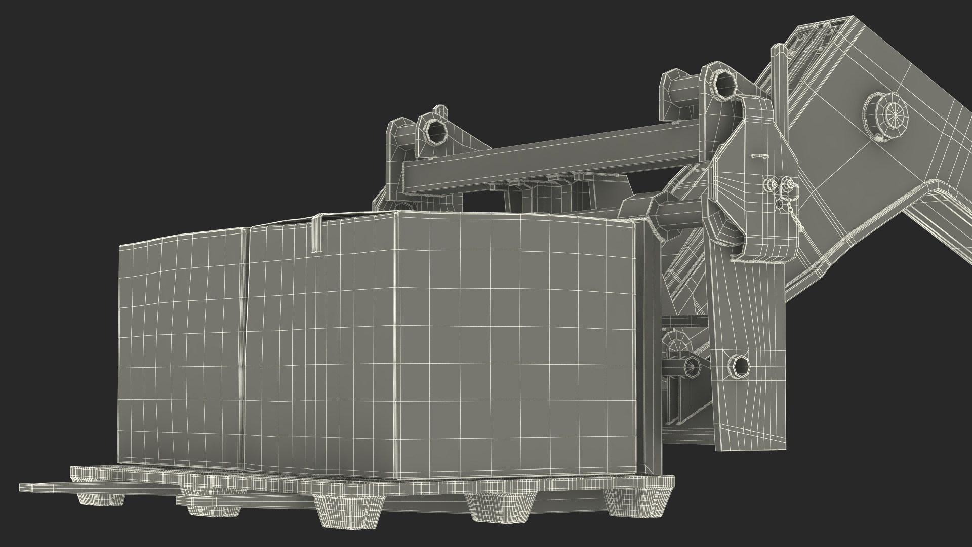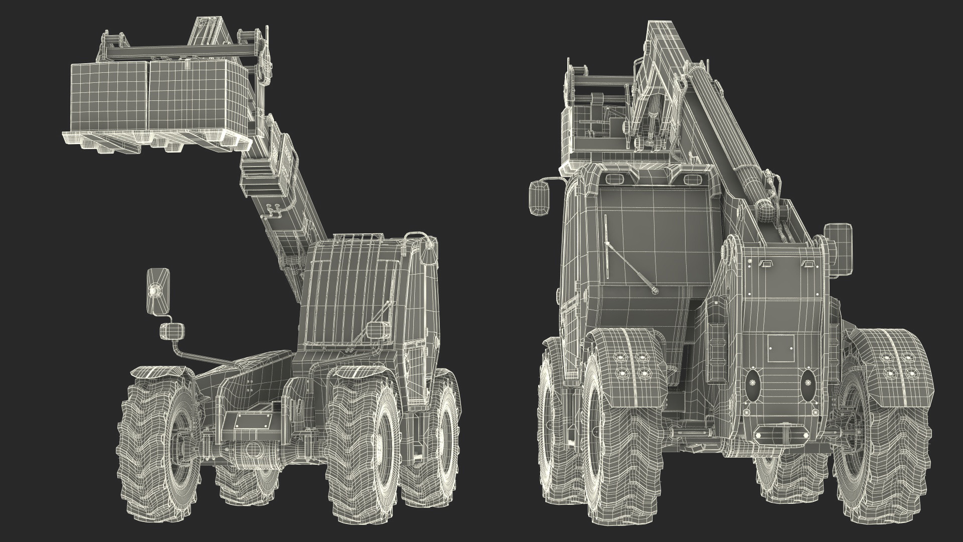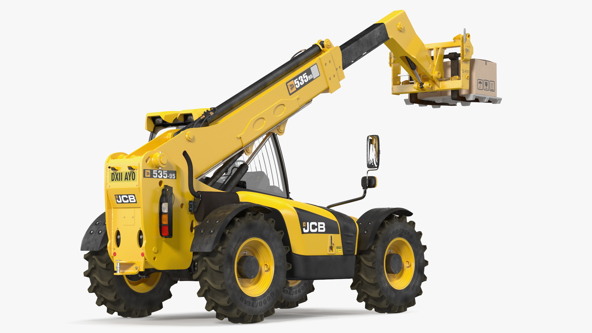 Forklift Truck JCB 535 with Pallet and Boxes is a three-dimensional model of fork-lift type, material handling equipment which can be used in agriculture, building works, construction, and other industries to lift and move heavy loads.