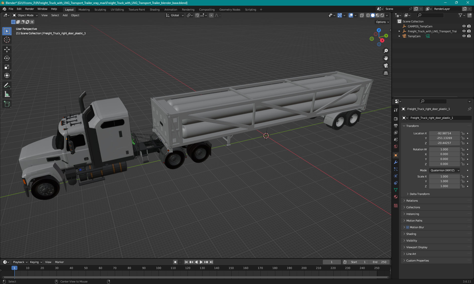 Freight Truck with LNG Transport Trailer is a high quality, photo real 3d model that will enhance detail and realism to any of your rendering projects. The model has a fully textured, detailed design that allows for close-up renders, and was originally modeled in 3ds Max 2020 and rendered with V-Ray. Renders have no postprocessing!