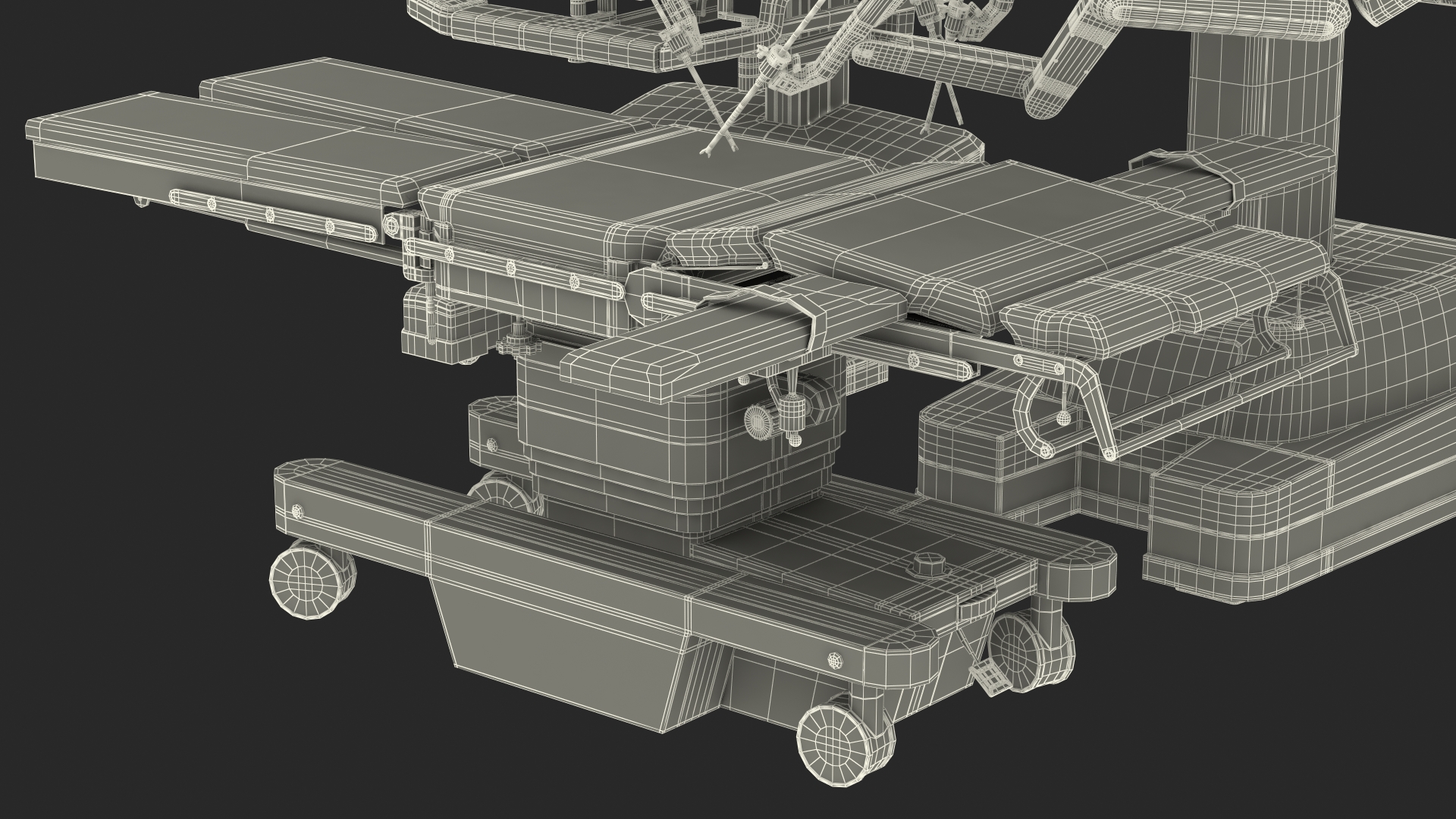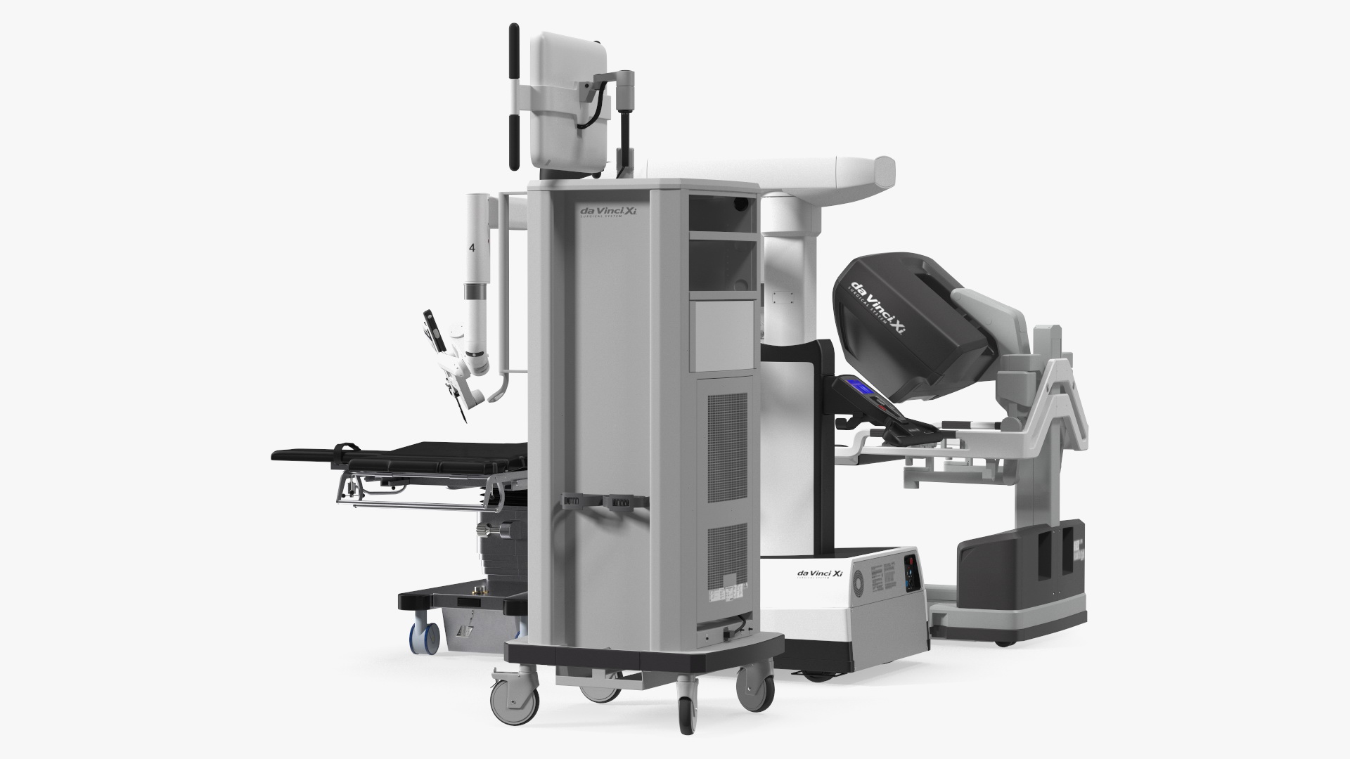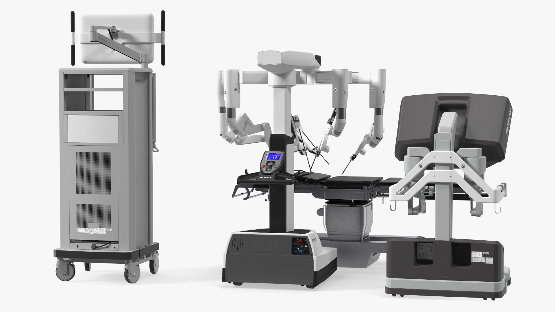 Full Da Vinci Surgical System Rigged with Operating Table is a three-dimensional model of a hi-tech robotic machinery or robot surgical system with special hospital operating table equipment.