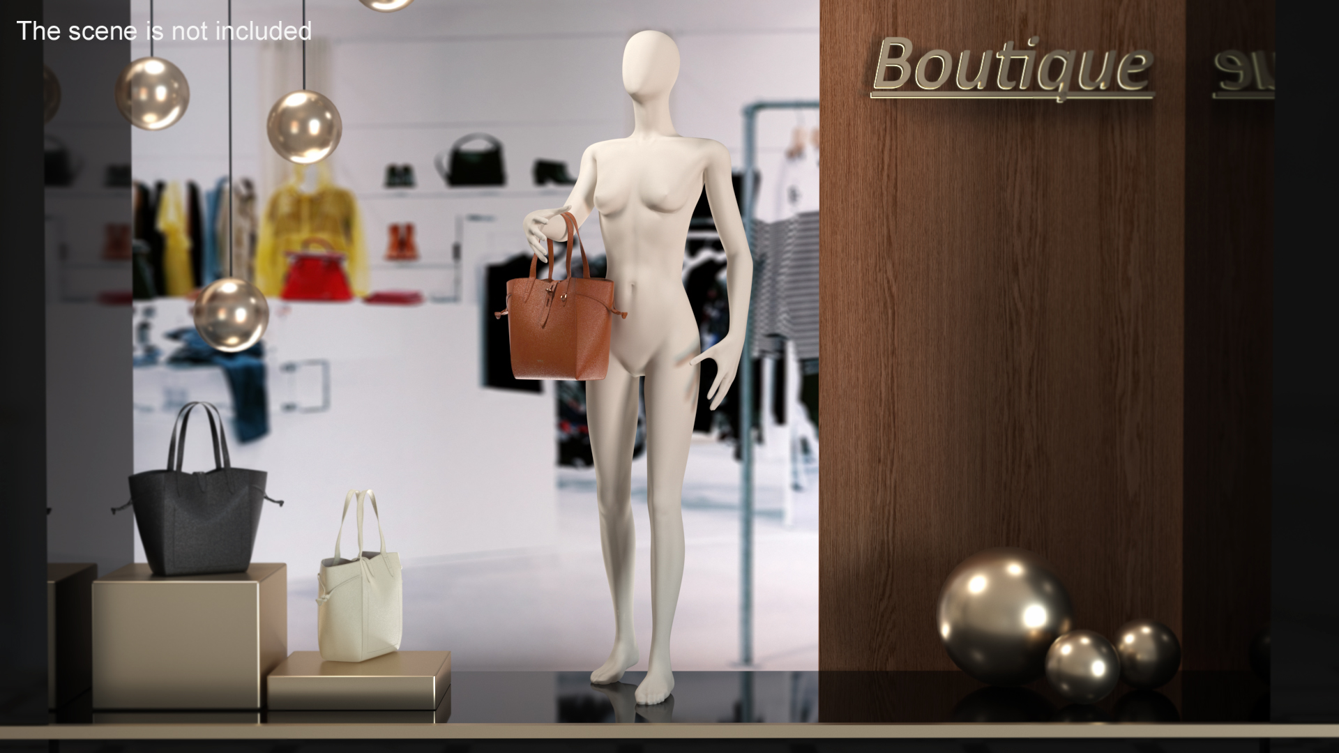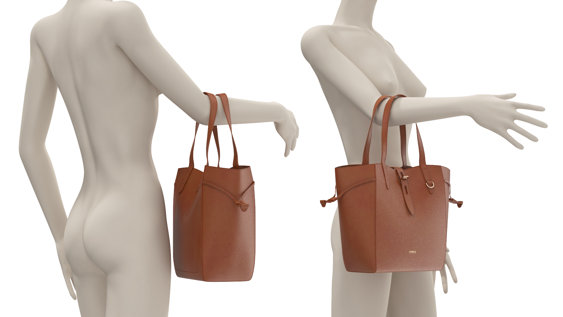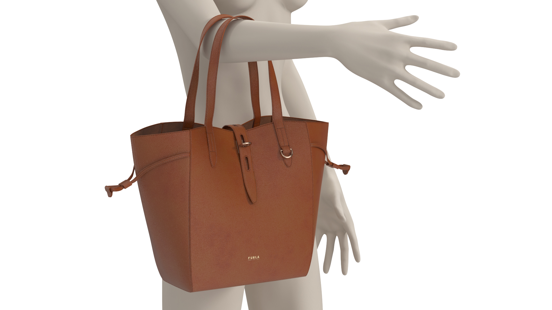 Furla Net Tote Bag Cognac on Mannequin is a 3d model of women's tote bag (ladies' leather tote bag), which is a versatile and spacious handbag which is displayed on a mannequin.