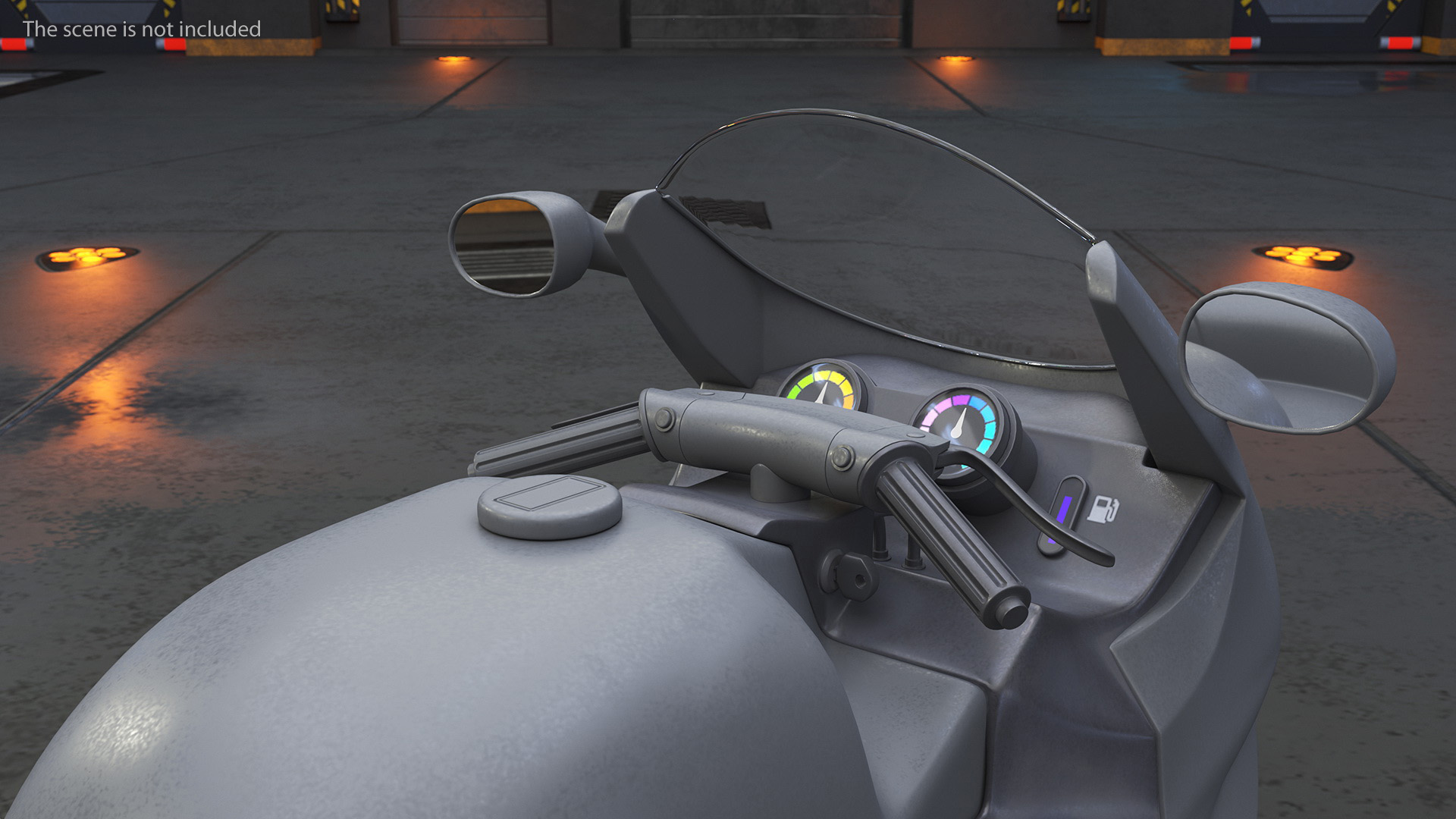 Futuristic Concept Motorcycle Gray Rigged is a three-dimensional model of Sci-fi Flying Motorcycle that is a compact, science fiction style, flying, futuristic bike-like, jet propulsion vehicle.