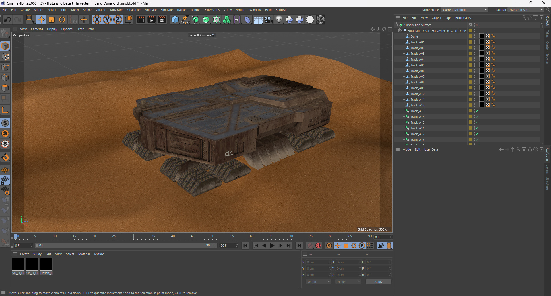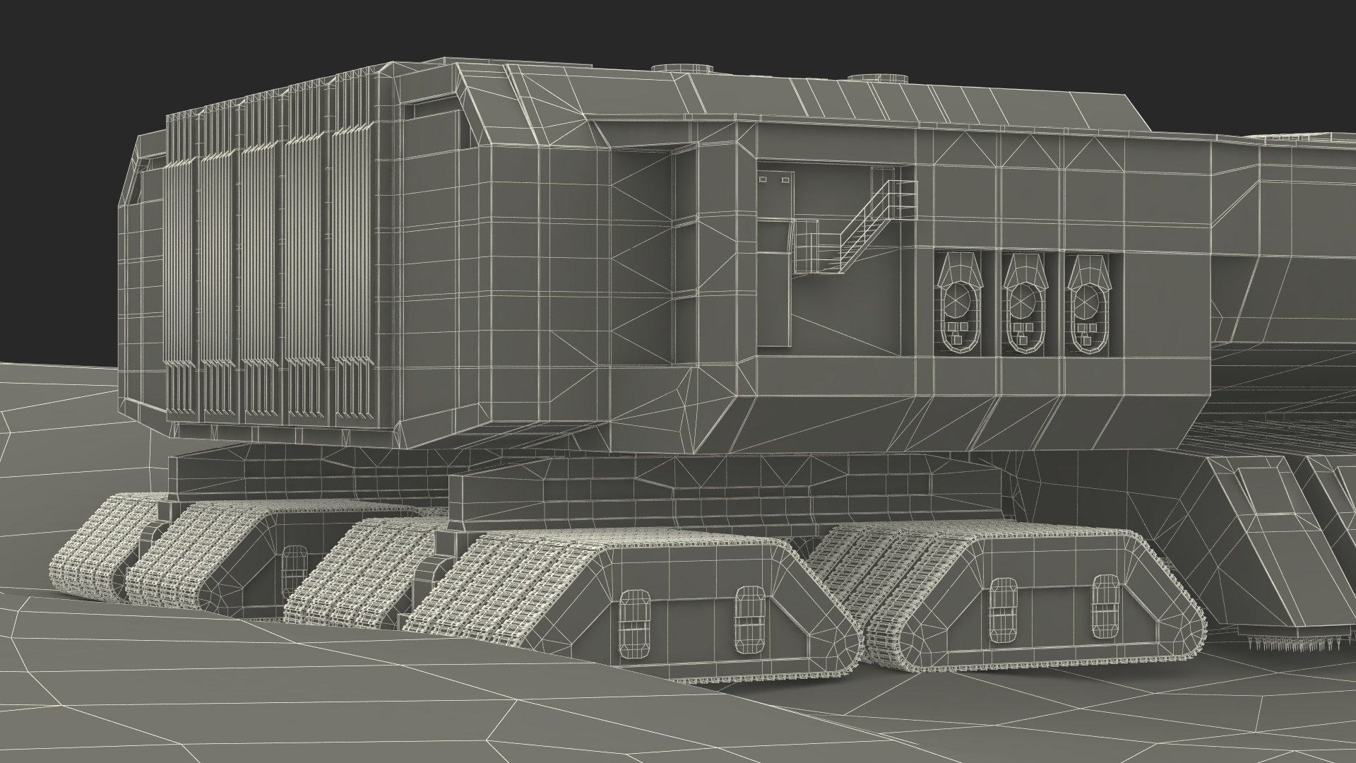 Futuristic Desert Harvester in Sand Dune is a 3d model of an advanced industrial vehicle designed to operate in vast desert landscapes, specifically crafted for harvesting resources from arid environments and navigating challenging sand dunes.