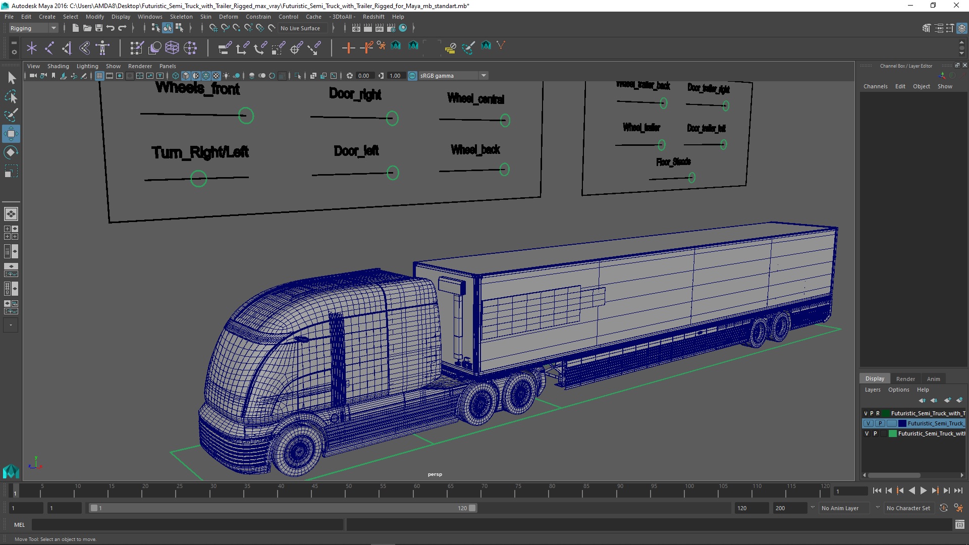 Futuristic Semi Truck with Trailer Rigged for Maya is fully rigged and is ready to be animated in Maya. You can easily position it the way you need or animate it the way your project requires. See the screenshots to get an idea of how rigging works. The pose of the model on the render images is an example and can be recreated using rig, it is not initially included into the product.