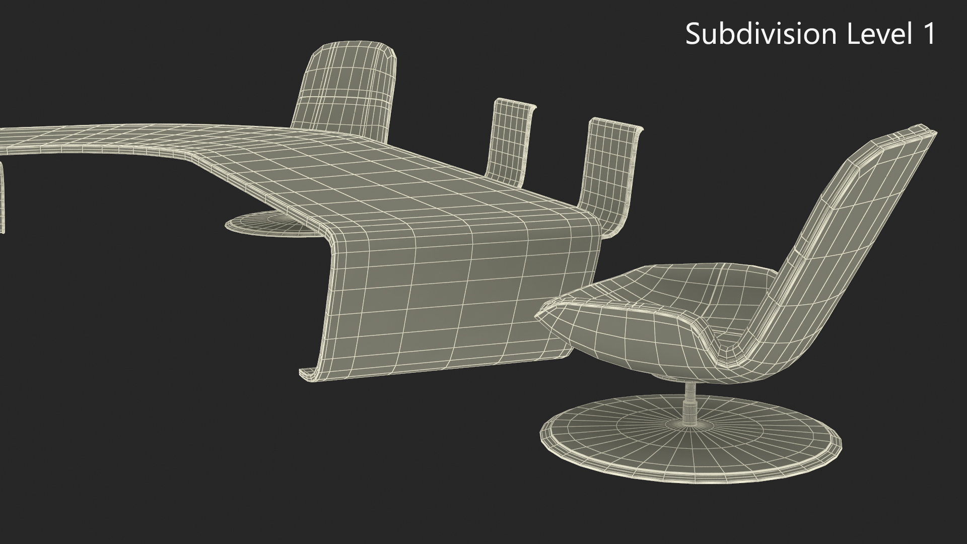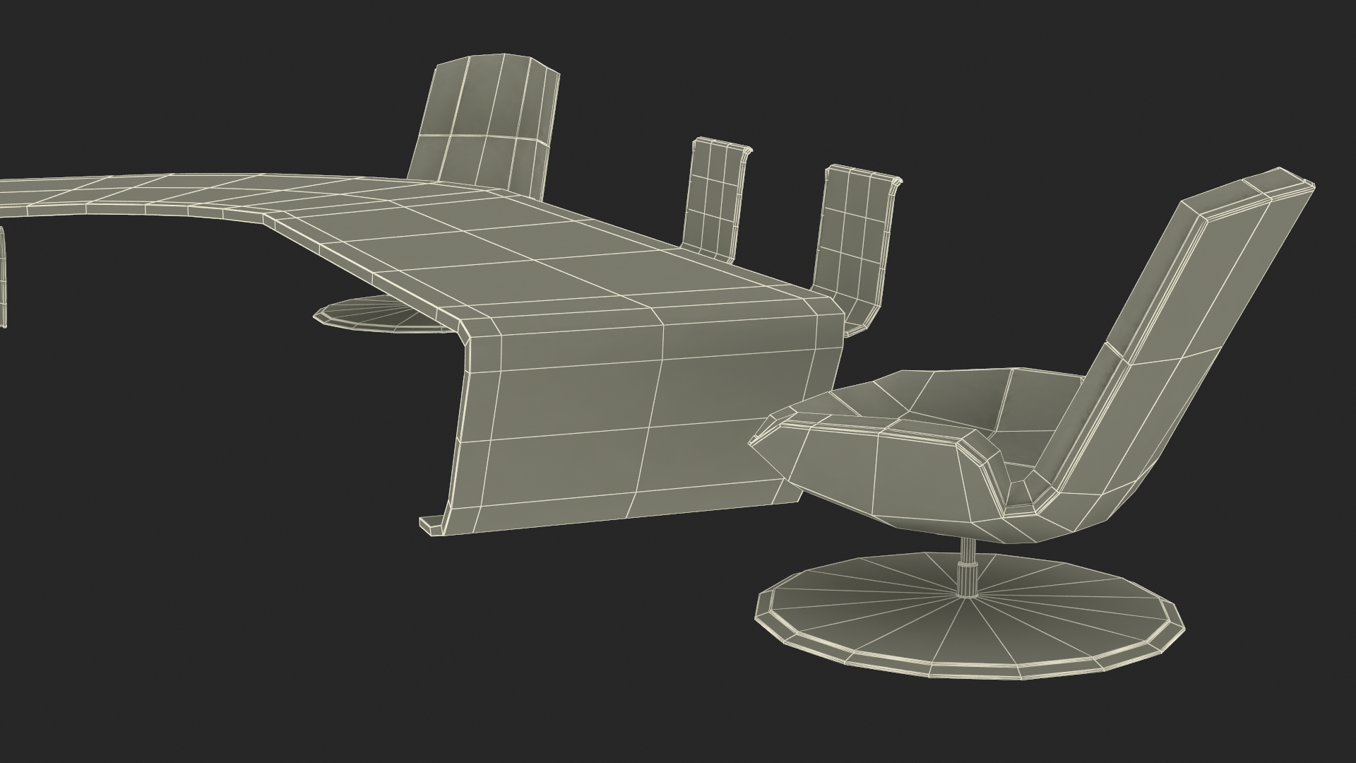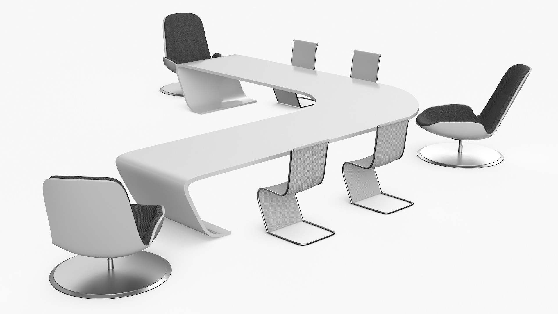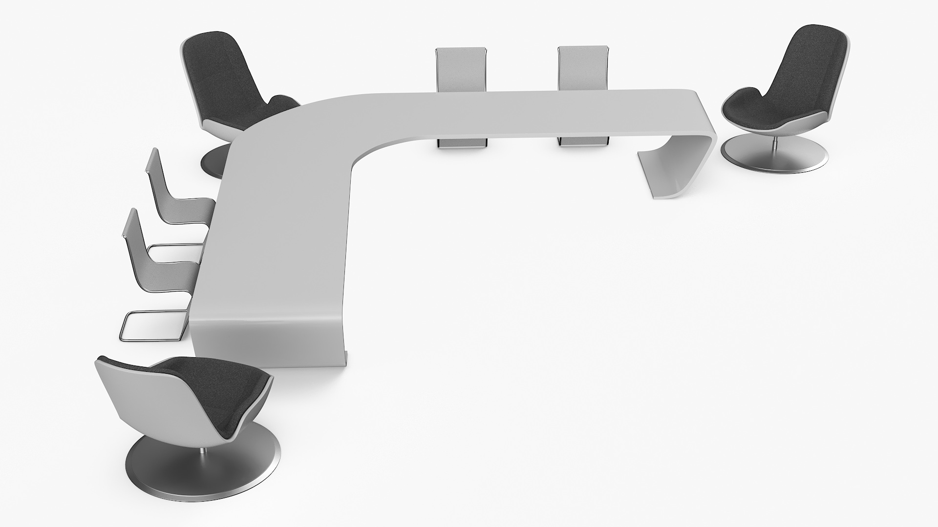 Futuristic Table with Chairs is a 3d model of an innovative and contemporary office set, consisting of a sleek table accompanied by uniquely styled chairs.