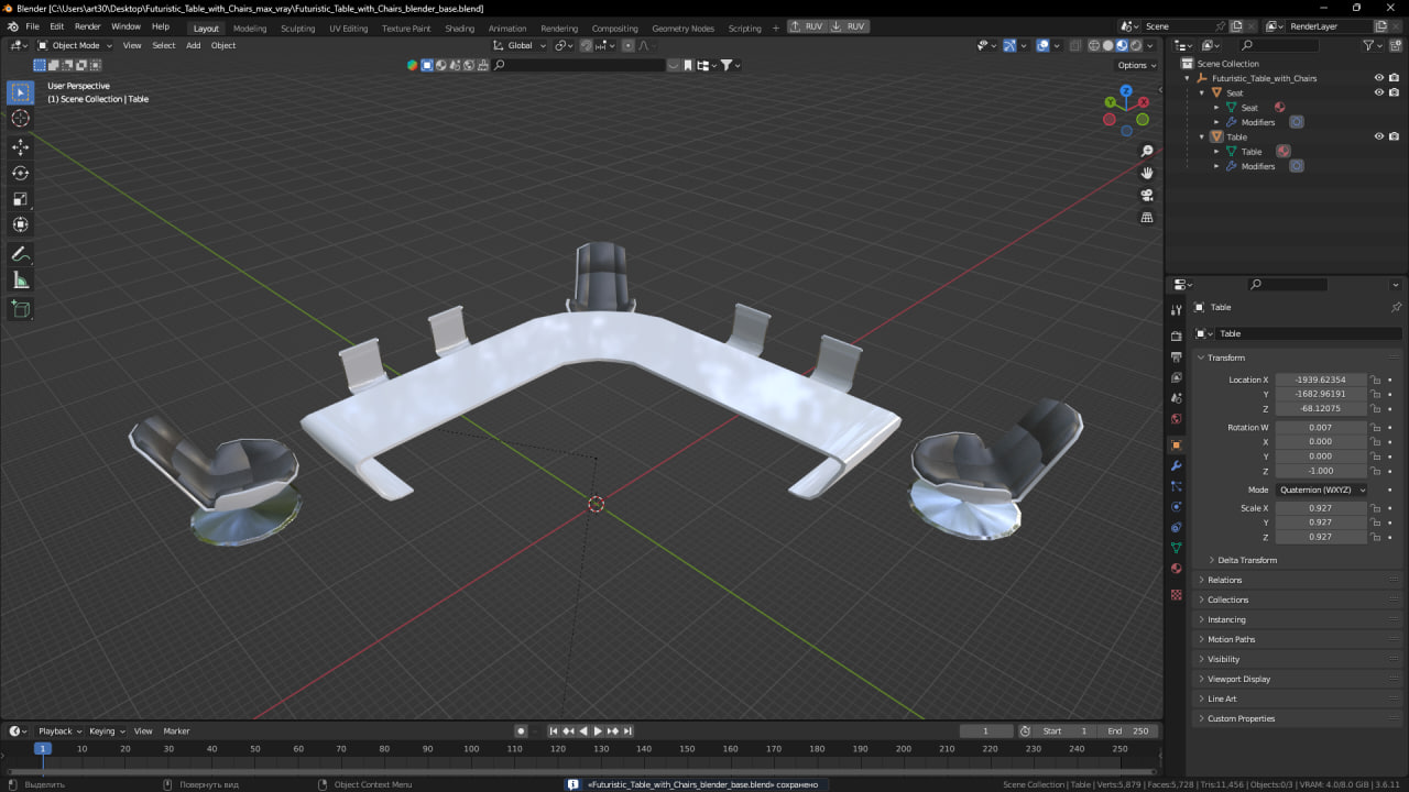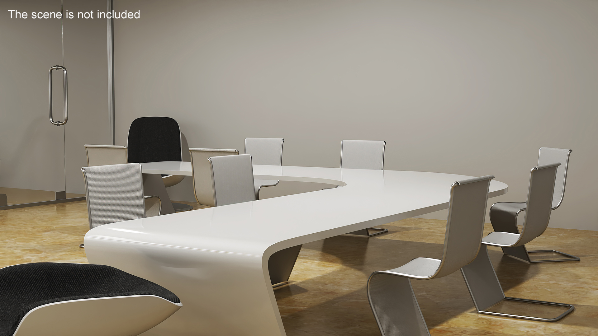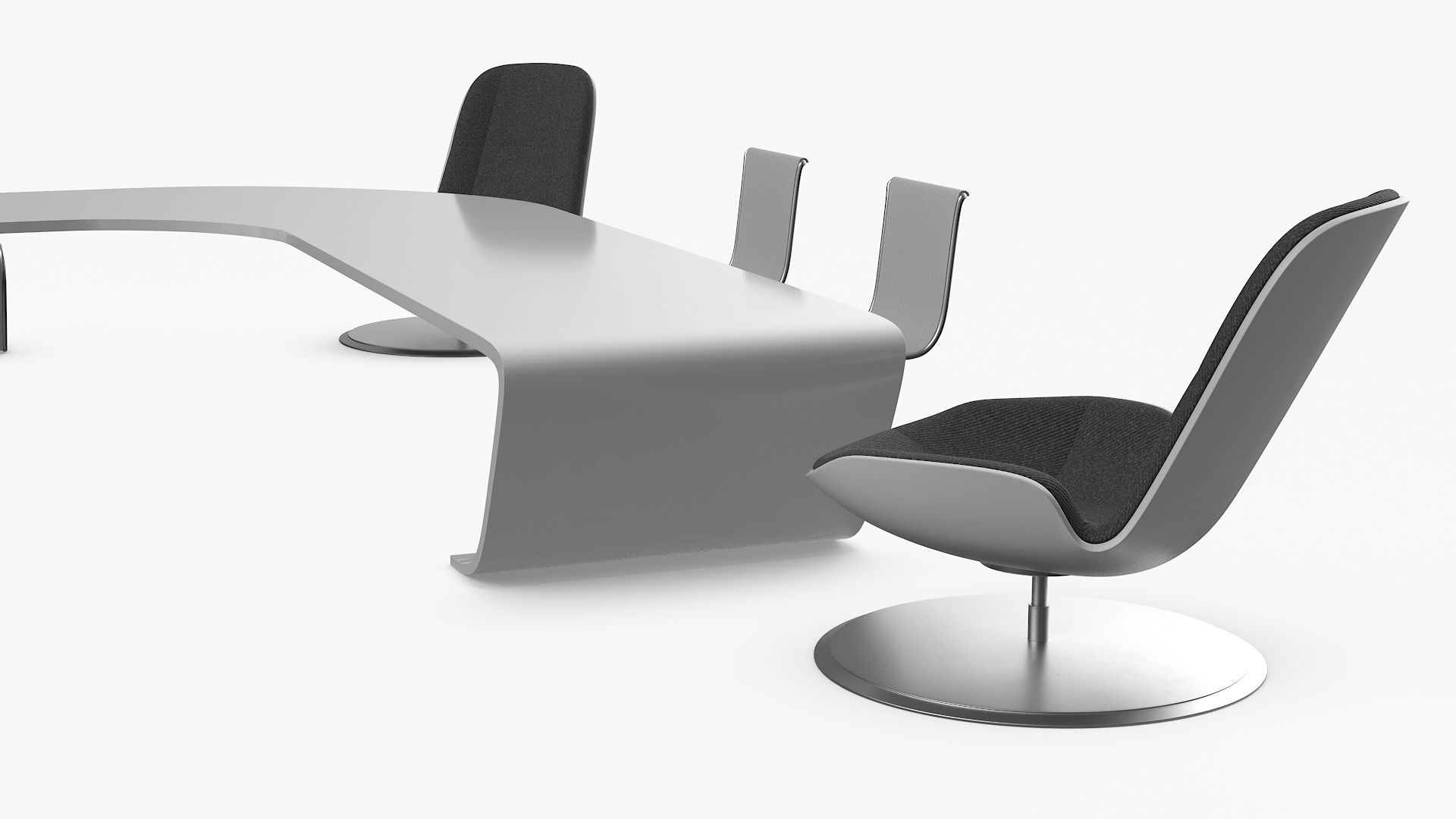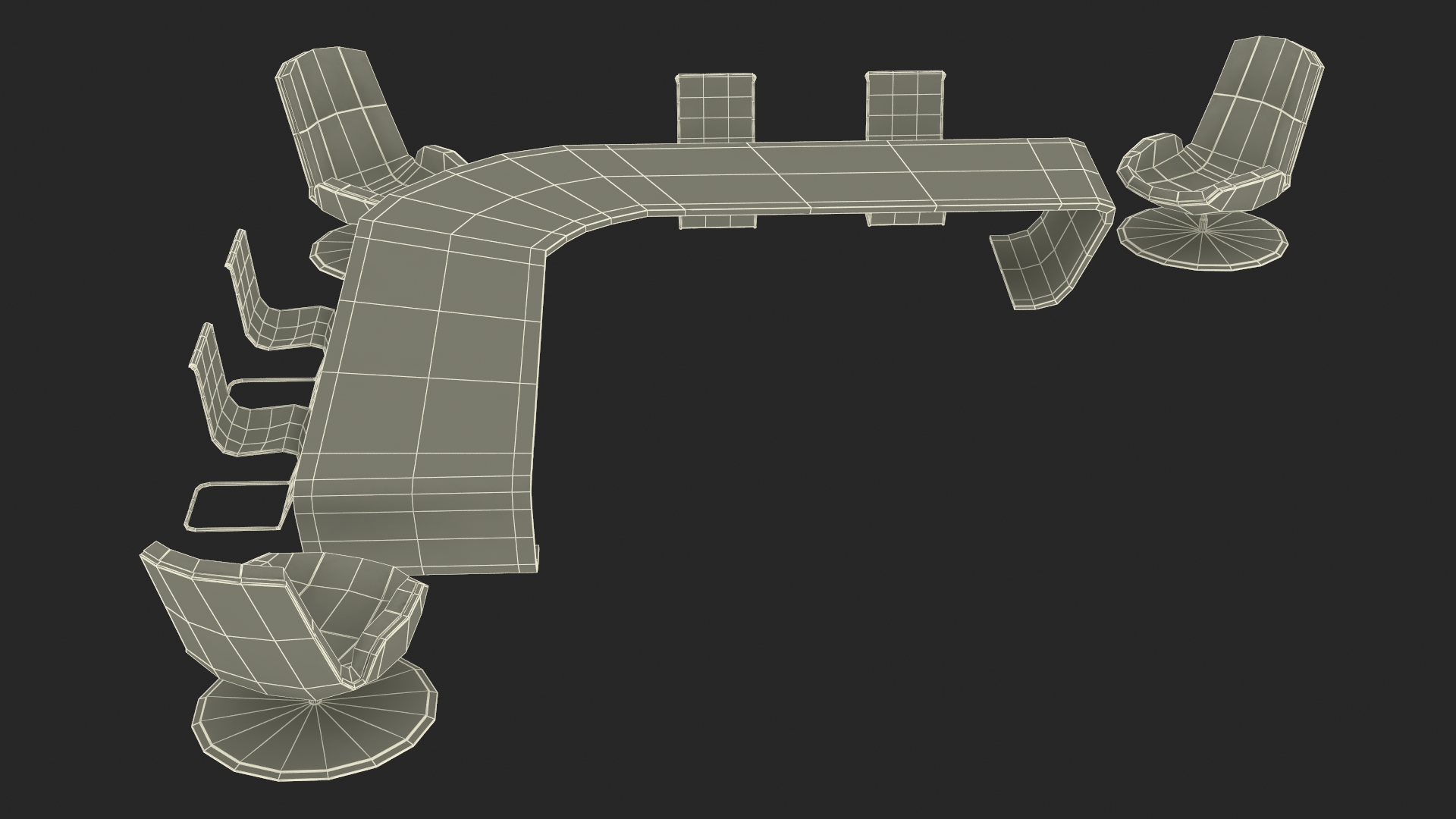 Futuristic Table with Chairs is a 3d model of an innovative and contemporary office set, consisting of a sleek table accompanied by uniquely styled chairs.