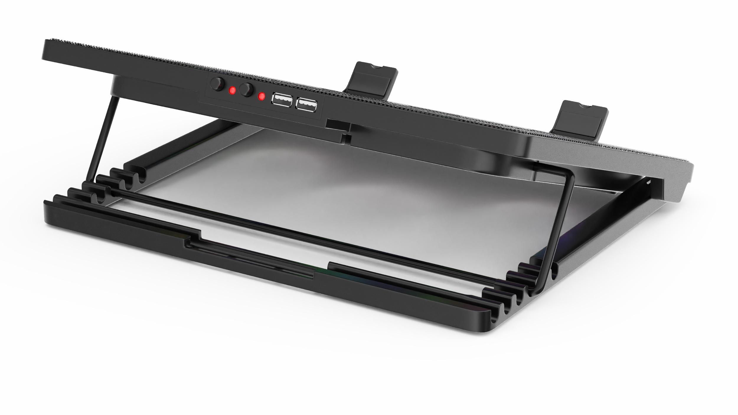 Gaming Laptop Cooling Pad with RGB Lighting is a three-dimensional model of special cooling pad gadget (contemporary ergonomic laptop stand) with built-in fans, USB ports and an adjustable height angle mount stand.