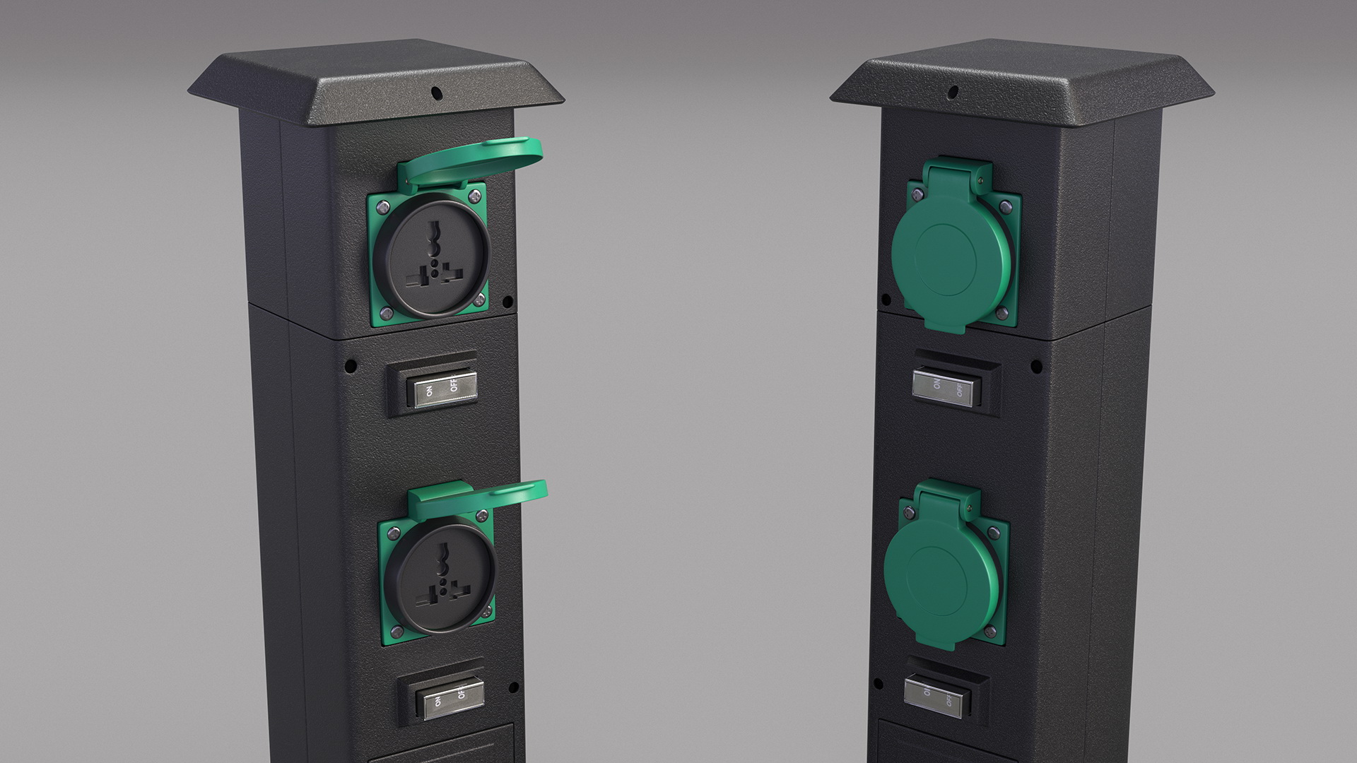 Garden Energy Column with 4 Socket and Switches is a three-dimensional model of garden energy column, which is equipped with four sockets, lids (covers) and switches, and which is an outdoor electrical unit primarily used in gardens or outdoor settings.