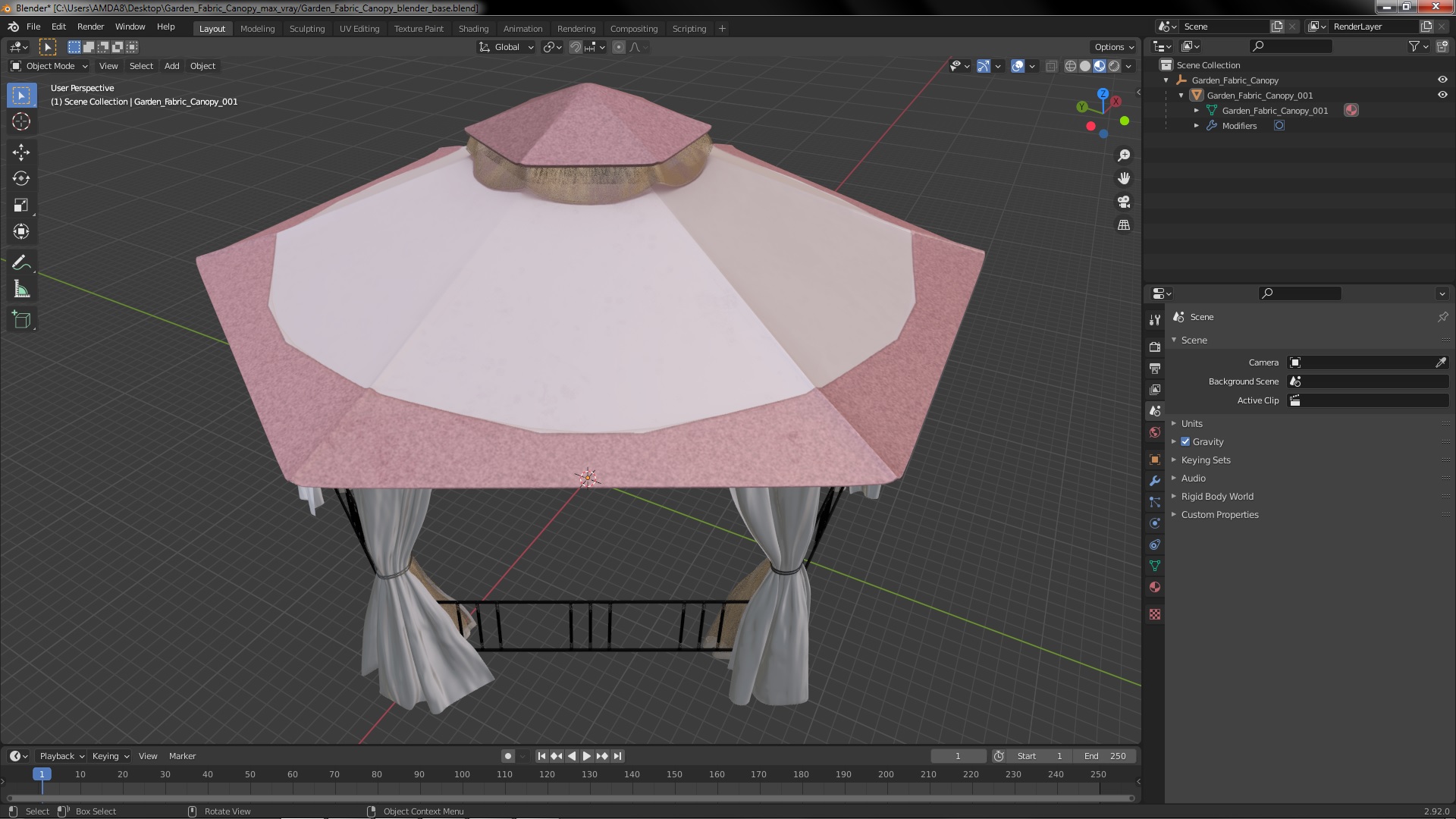 Garden Fabric Canopy is a high quality, photo real 3d model that will enhance detail and realism to any of your rendering projects. The model has a fully textured, detailed design that allows for close-up renders, and was originally modeled in 3ds Max 2020 and rendered with V-Ray. Renders have no postprocessing!