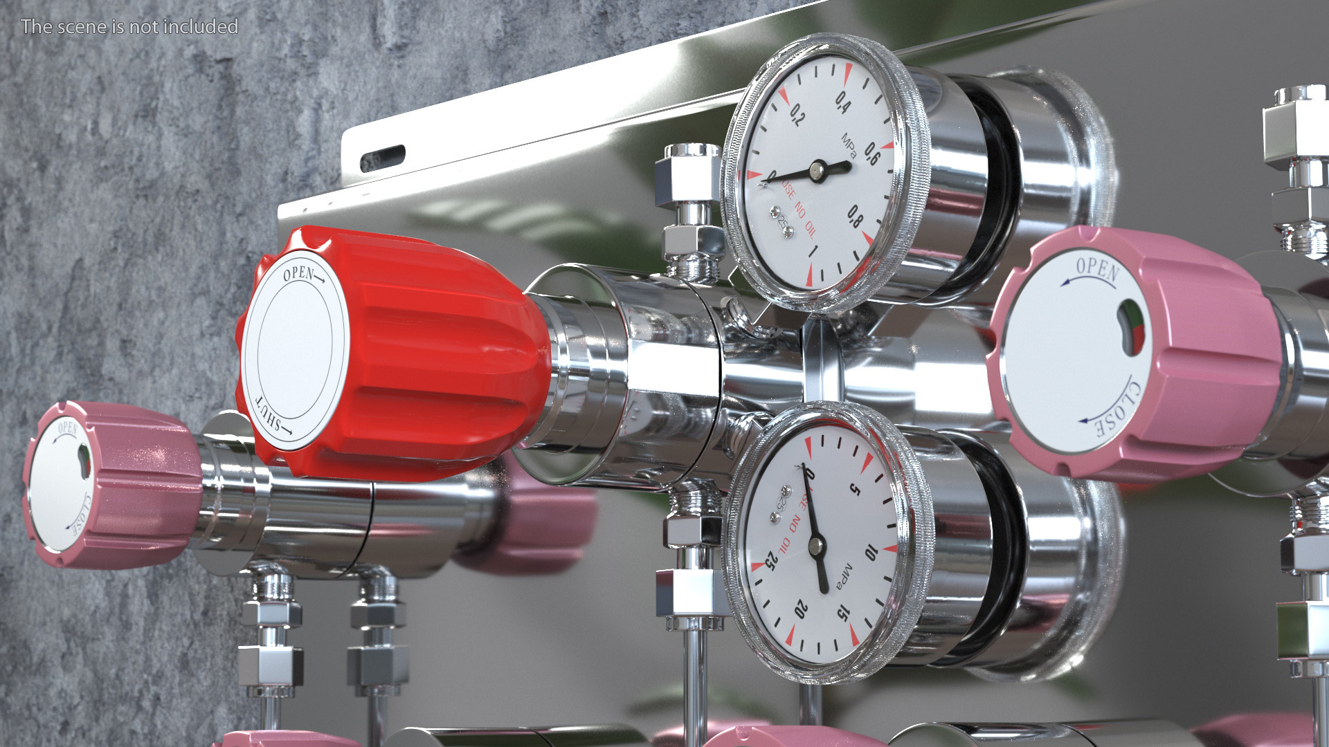 Gas Regulator with Two Gauges is a three-dimensional model of special gas supply high pressure regulatory equipment or device.