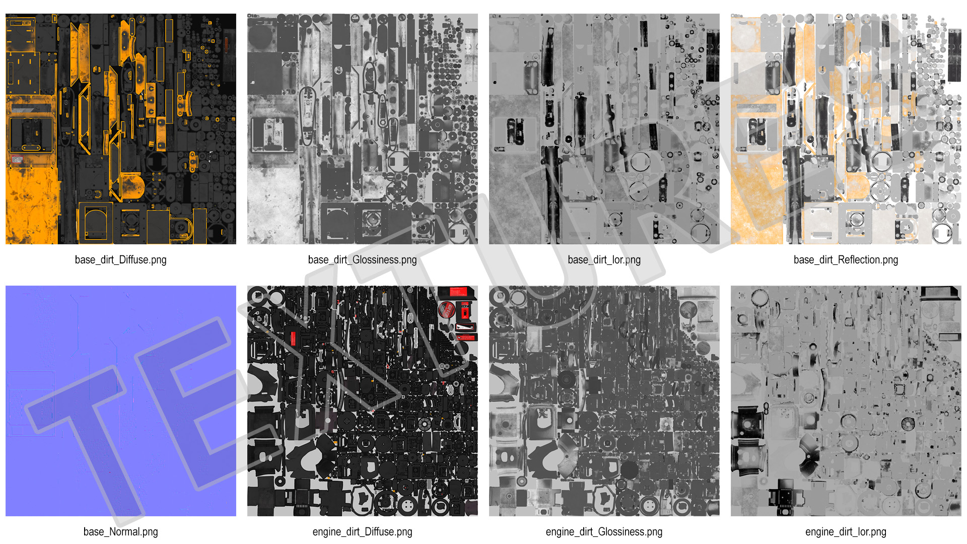 All textures and materials are included and mapped. (All colors can be easily modified.)