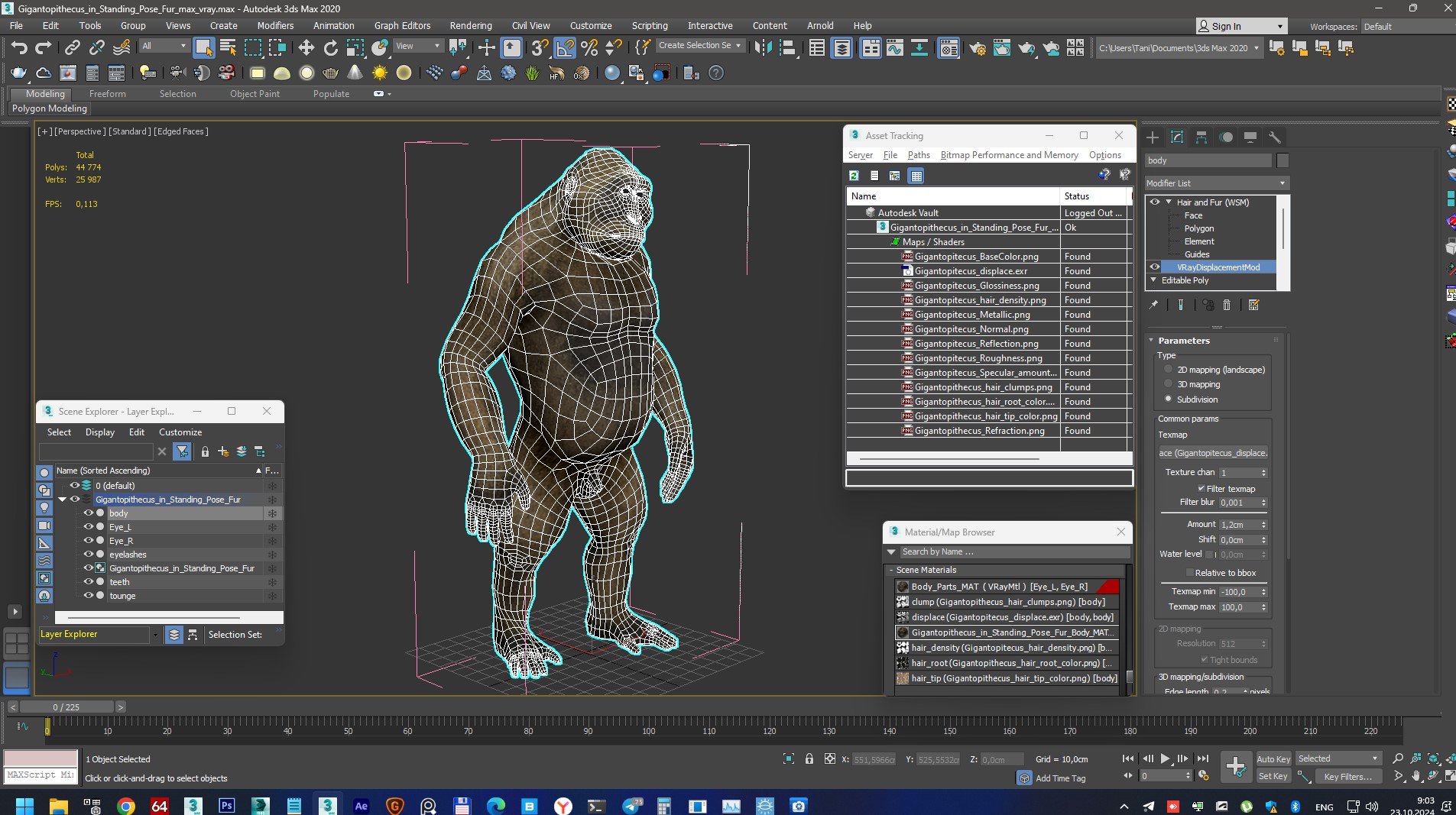 Gigantopithecus in Standing Pose Fur is a 3d model of large ape in an upright position, similar to modern humans or great apes. This stance likely involves its strong hind limbs supporting its massive body, with arms positioned either at its sides or slightly forward for balance. This pose highlights its bipedal capabilities, although it was primarily adapted for a predominantly quadrupedal lifestyle. For wild animals, great apes, animal protection, environmental protection, zoology, tours, wildlife, biology, veterinary education, and history of travels promotional projects. Gigantopithecus in Standing Pose Fur is a high quality, photo real 3d model that will enhance detail and realism to any of your rendering projects. The model has a fully textured, detailed design that allows for close-up renders, and was originally modeled in 3ds Max 2020 and rendered with V-Ray. Renders have no postprocessing! Gigantopithecus in Standing Pose Fur has a 3dsmax Fur modifier, hair customizable (hair count, hair segments, hair color, root size, tip size, etc). Hope you like it! ***** Features: - High quality polygonal model, has real dimensions. Easy to merge into your scene. - Units: cm - The model was created with the optimal number of polygons. (The Meshsmooth modifier is assigned to the original mesh. Easy to increase mesh resolution if necessary.) - All the objects come with complete UVs All textures and materials are included and mapped. (All colors can be easily modified.) - All objects are logically named and grouped for ease of objects selection and scene management. - No part-name confusion when importing several models into a scene. - No cleaning up necessary (Model does not include any backgrounds or scenes used in preview images.) - just drop model into your scene. - No special plugin needed to open scene. - PBR Materials ***** File Formats: - 3ds Max ***** Textures Formats: - 1 exr (8192x8192) - 4 png (4096x4096) - 8 png (8192x8192) ***** 3d Molier International is a team of 3D artists with over a 15 years of experience. The company participated in various projects allowing us to learn our clients needs. Every model we build goes through thorough Quality assessment both visual and technical to make sure the assets look realistic and the models are of the best quality, which you can tell by looking at the renders - none of the has any postprocessing. We produce 3D models. This is our main activity. Our goal is to create a 3D copy of all objects on the world. Buy 3D models from professionals! Also check out our other models, just click on our user name to see complete gallery. (c) 3d_molier International - 2025