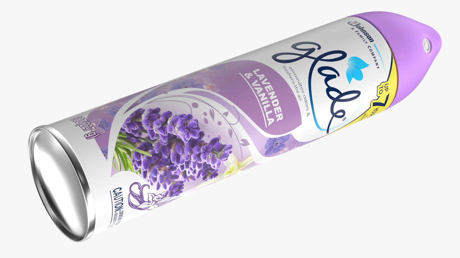 Glade Air Freshener Aerosol Spray Lavender and Vanilla consumer product that emit fragrance and used for odor elimination.