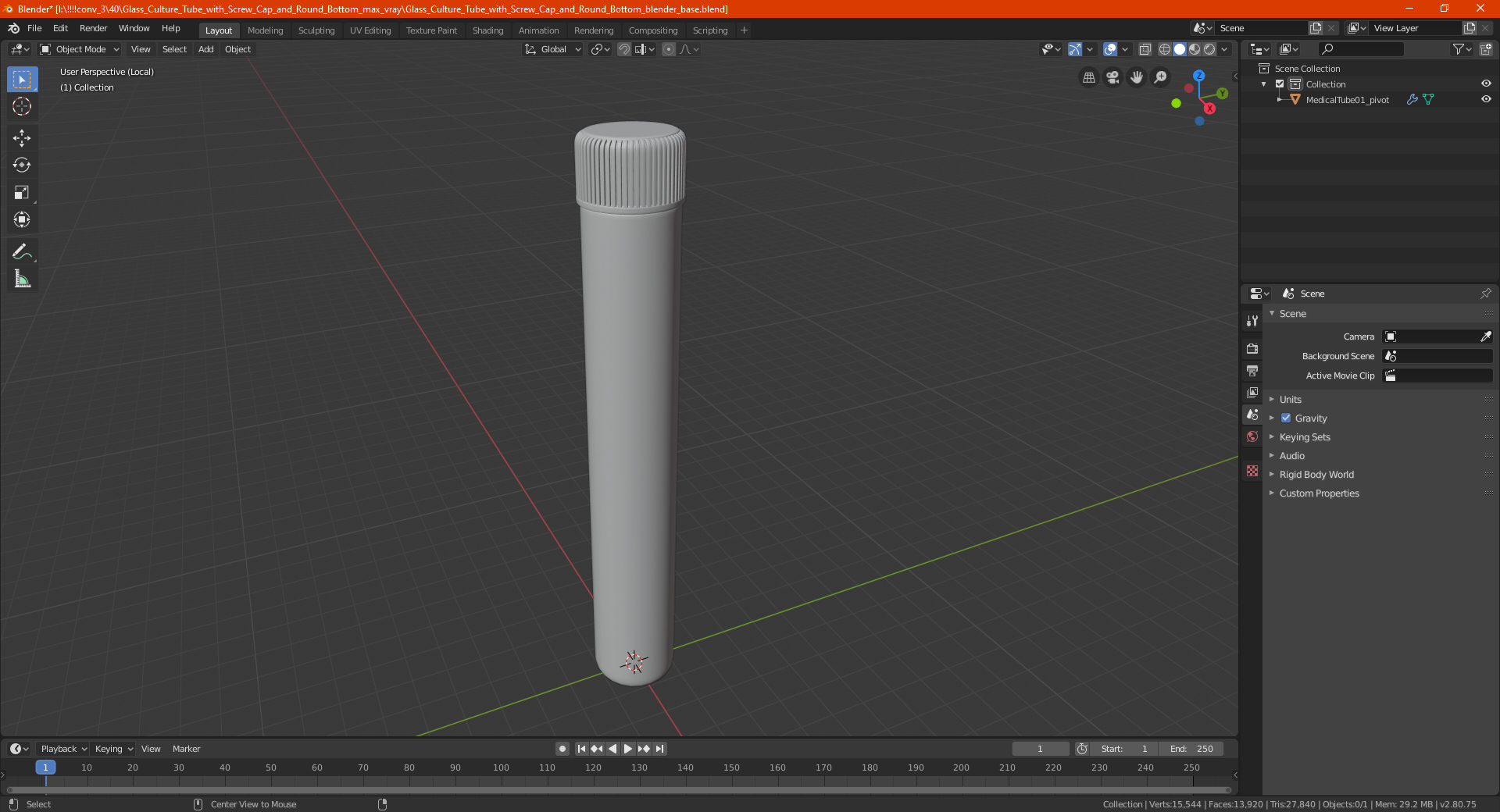 Glass Culture Tube with Screw Cap and Round Bottom is a high quality, photo real 3d model that will enhance detail and realism to any of your rendering projects. The model has a fully textured, detailed design that allows for close-up renders, and was originally modeled in 3ds Max 2020 and rendered with V-Ray. Renders have no postprocessing!