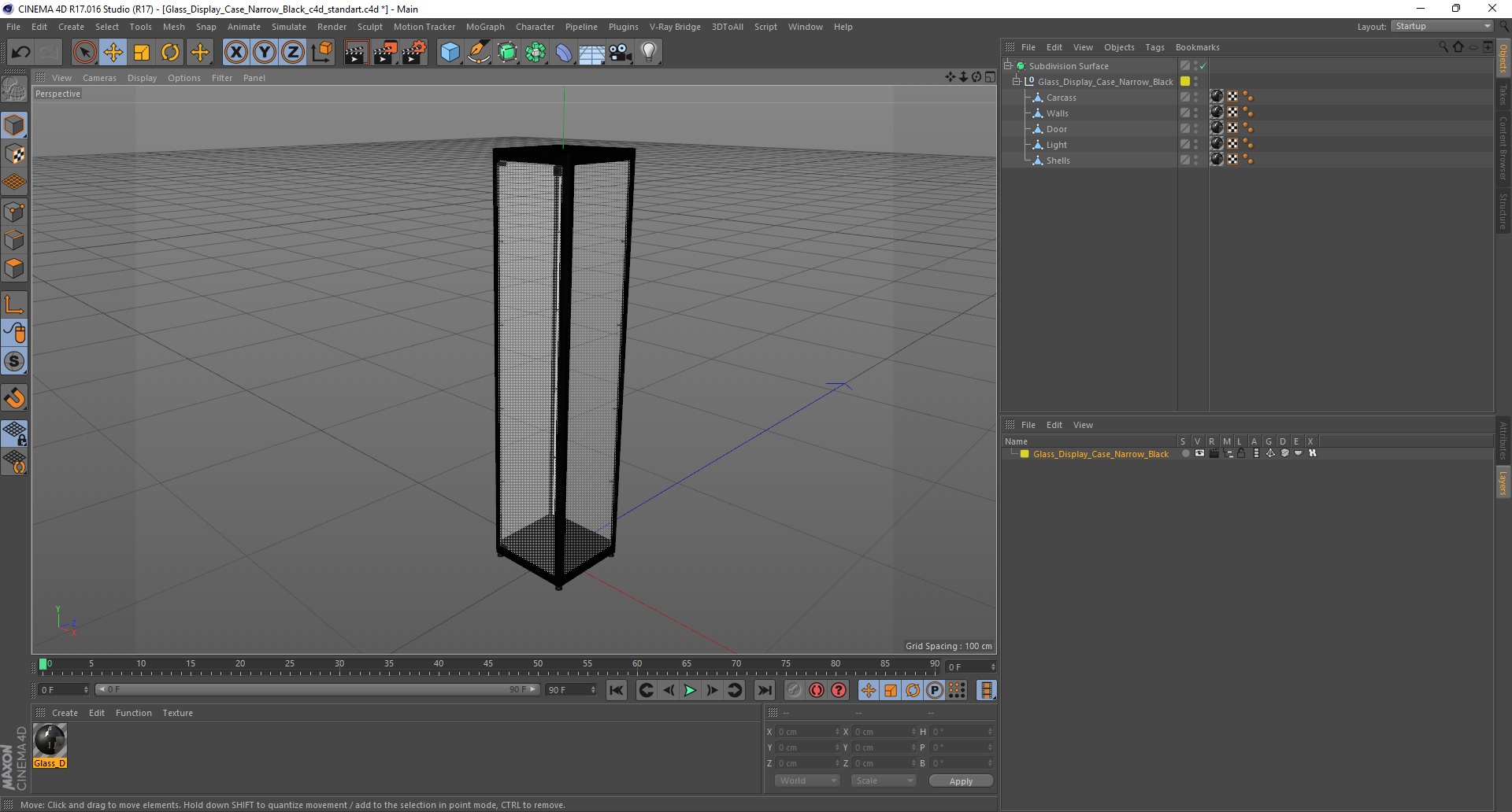 Glass Display Case Narrow Black is a three-dimensional model of a showcase or shop rack which constructed for displaying goods, awards or cups.
