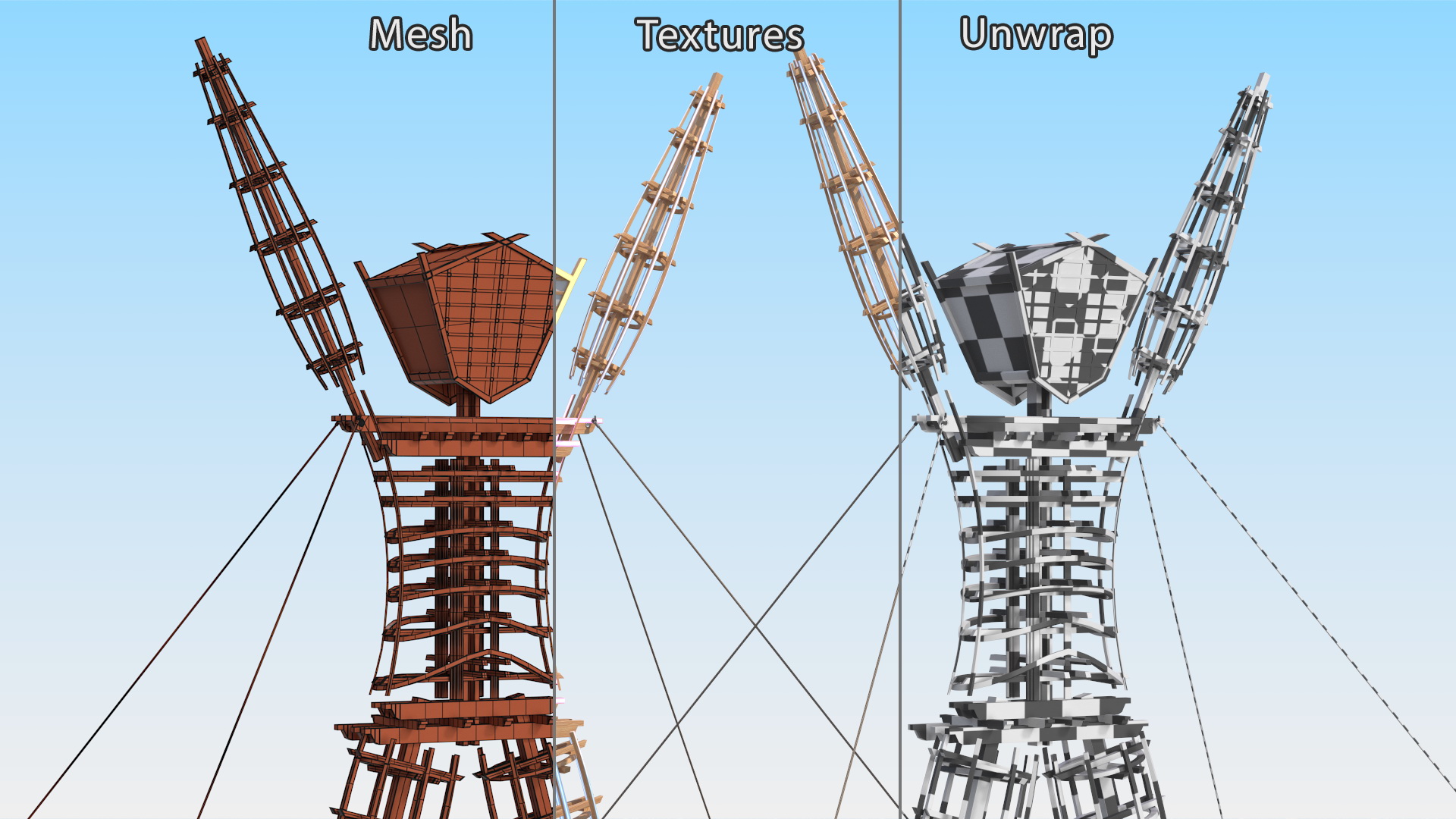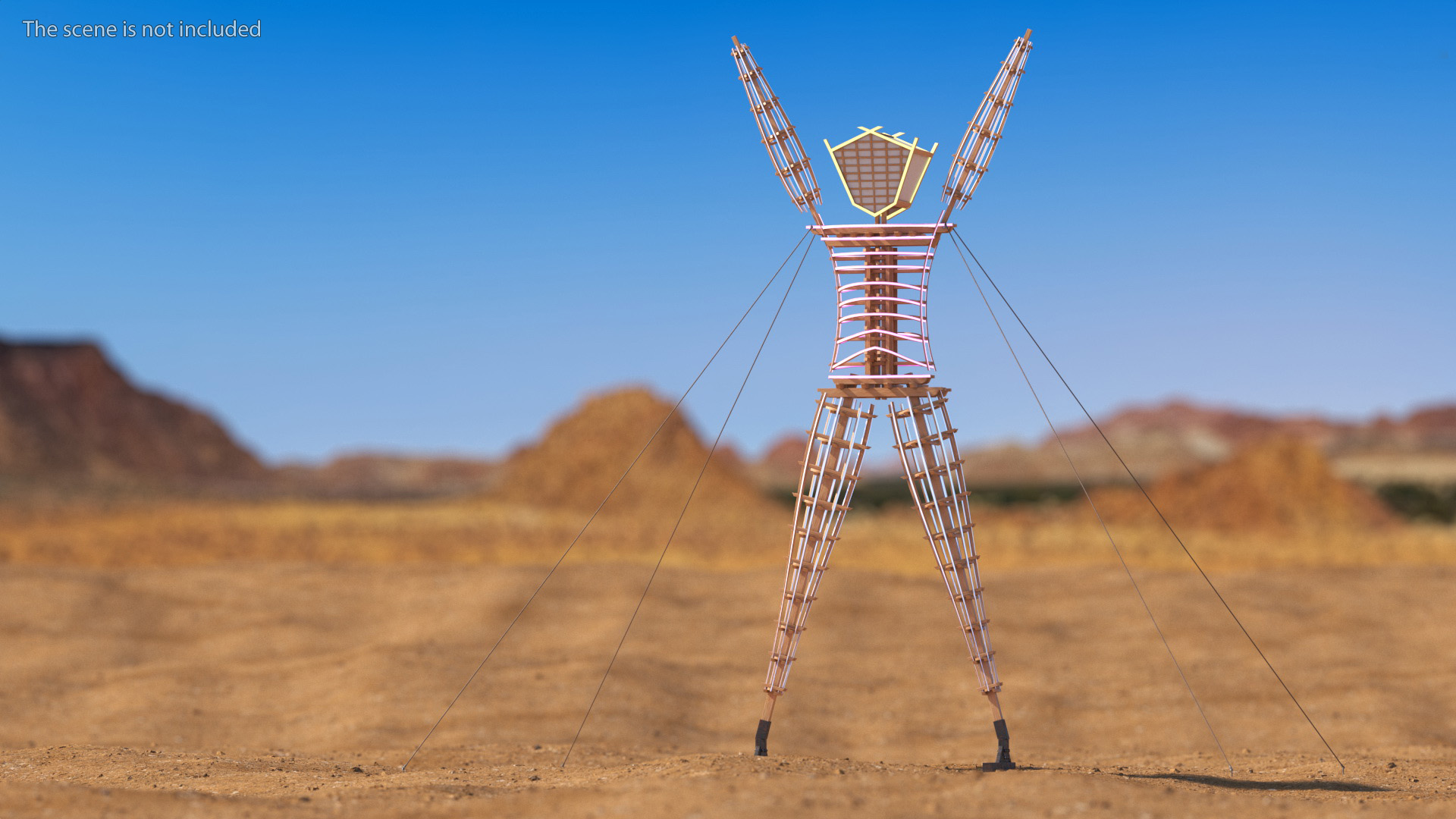 This glowing statue is designed with vibrant light effects, creating a striking and dynamic presence. The figure’s hands are lifted in a powerful, celebratory gesture, and it emits a soft, radiant glow, capturing the energy and artistic spirit of the Burning Man event. The model includes detailed textures and lighting, perfect for creating an ethereal or futuristic look in digital projects.