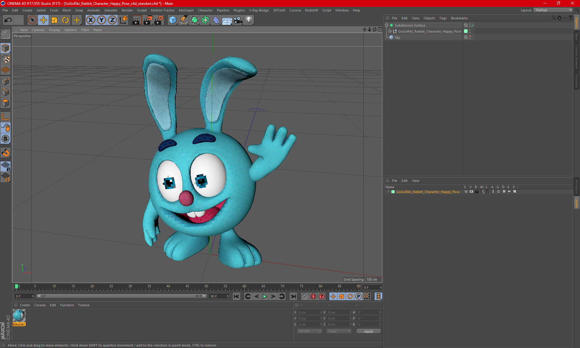 GoGoRiki Rabbit Character Happy Pose is a high quality, photo real 3d model that will enhance detail and realism to any of your rendering projects. The model has a fully textured, detailed design that allows for close-up renders, and was originally modeled in 3ds Max 2020 and rendered with V-Ray. Renders have no postprocessing!