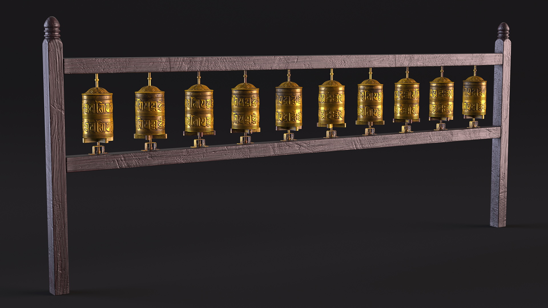 Gold Prayer Wheel is a 3D model of set of Buddhist prayer wheels which is the row of prayer wheels which are special cylindrical wheels that contains a mantra, prayer, or invocation written on it.