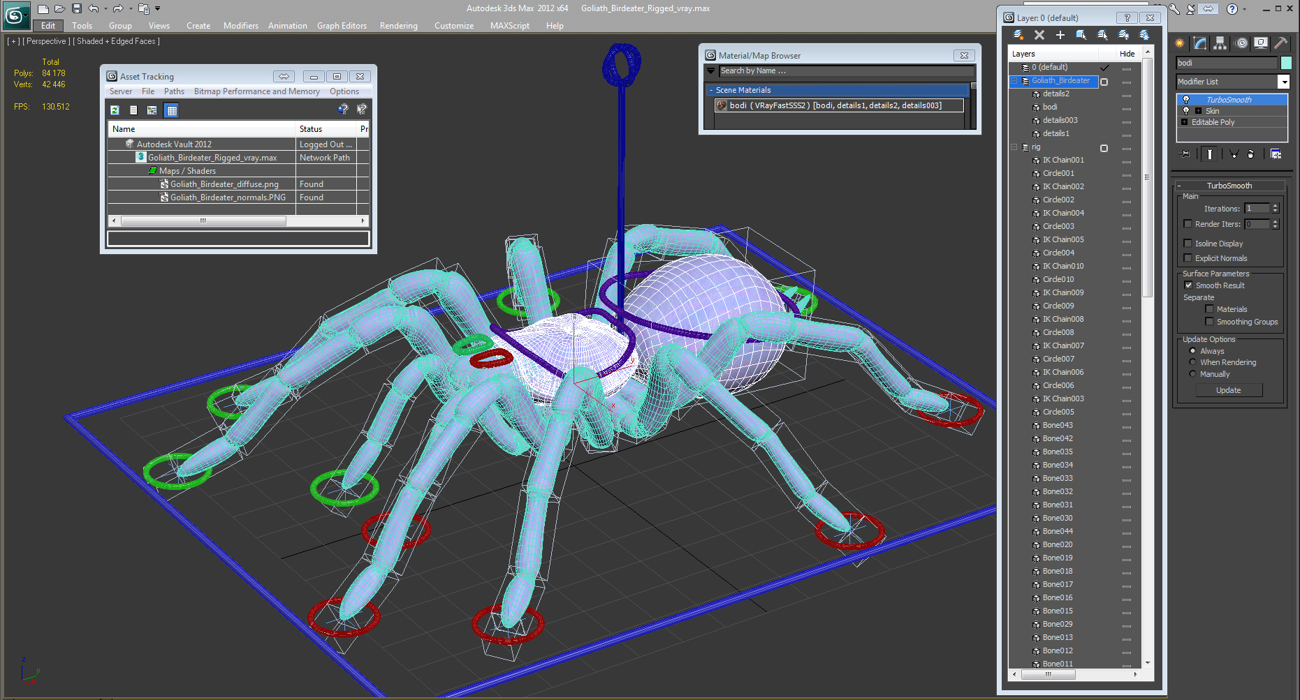 Goliath Birdeater Rigged is fully rigged and is ready to be animated. You can easily position it the way you need or animate it the way your project requires using helpers in 3D Studio Max. See the turntable to get an idea of how rigging works.