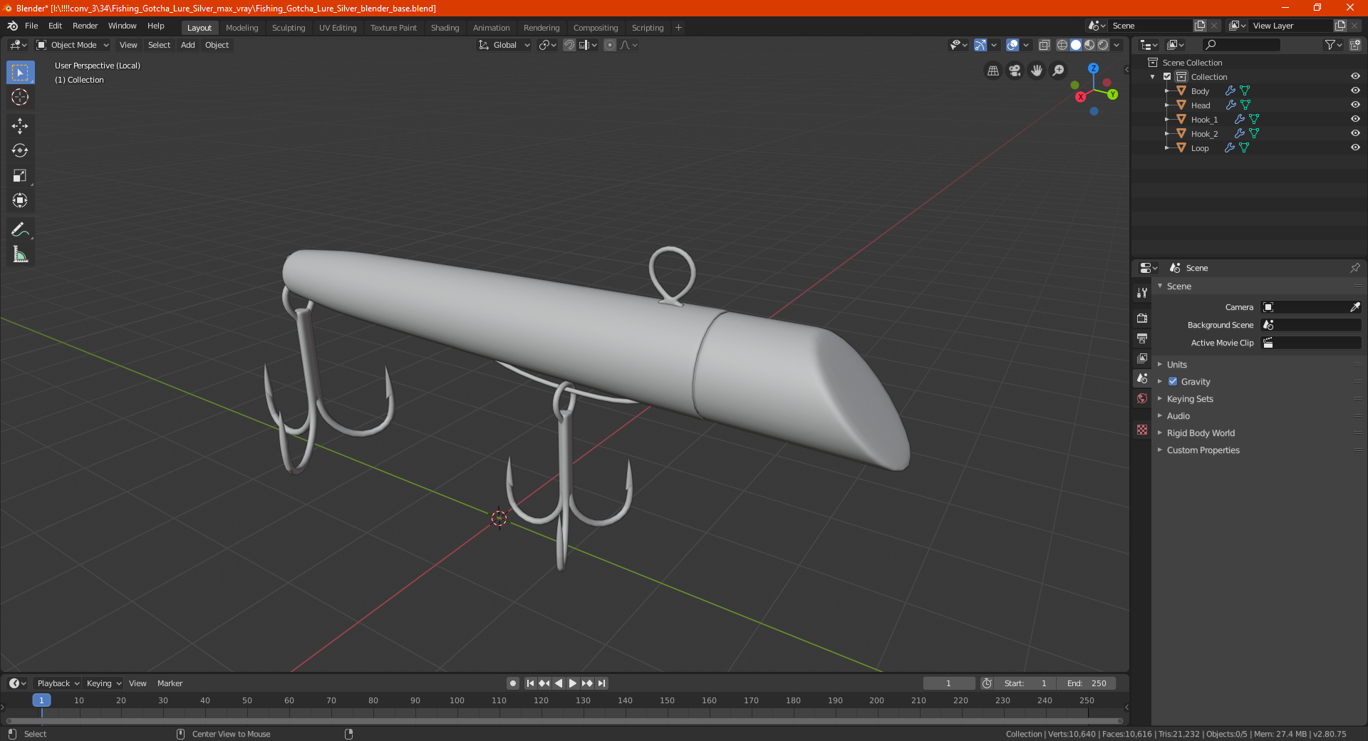 Gotcha Fishing Lure is a high quality, photo real 3d model that will enhance detail and realism to any of your rendering projects. The model has a fully textured, detailed design that allows for close-up renders, and was originally modeled in 3ds Max 2020 and rendered with V-Ray. Renders have no postprocessing!