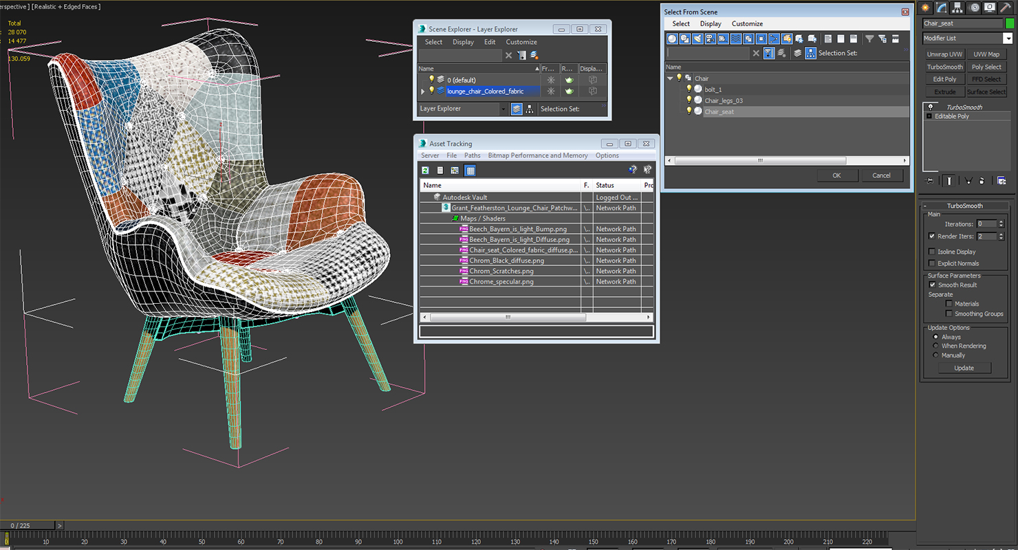 Grant Featherston Lounge Chair Patchwork is a high quality, photo real 3d model that will enhance detail and realism to any of your rendering projects. The model has a fully textured, detailed design that allows for close-up renders, and was originally modeled in 3ds Max 2020 and rendered with V-Ray. Renders have no postprocessing!