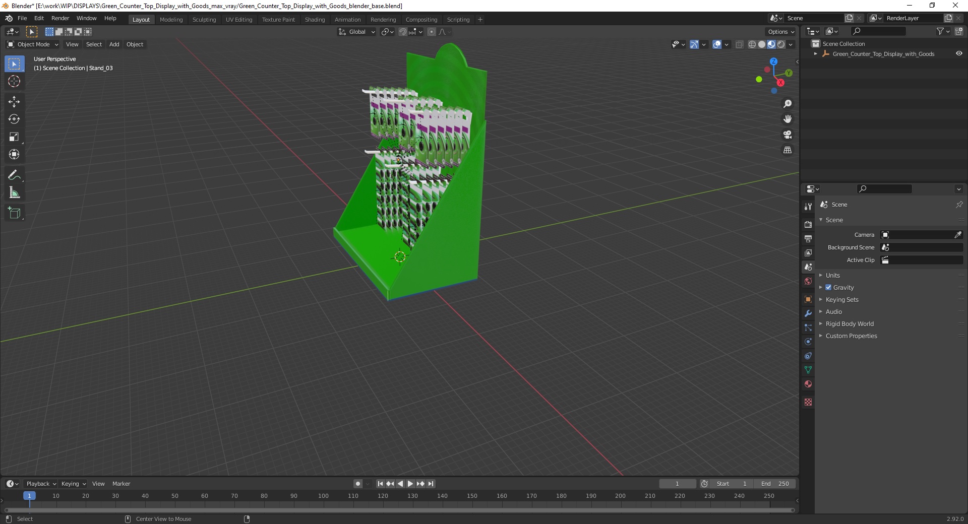 Green Counter Top Display with Goods is a high quality, photo real 3d model that will enhance detail and realism to any of your rendering projects. The model has a fully textured, detailed design that allows for close-up renders, and was originally modeled in 3ds Max 2020 and rendered with V-Ray. Renders have no postprocessing!