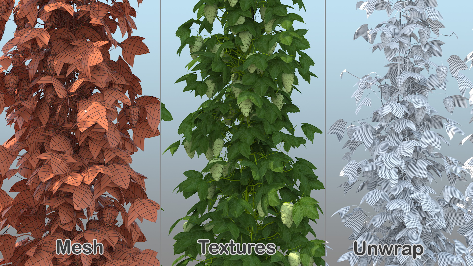 Green Growing Hops Plantation is a high quality, photo real 3d model that will enhance detail and realism to any of your rendering projects. The model has a fully textured, detailed design that allows for close-up renders, and was originally modeled in 3ds Max 2020 and rendered with V-Ray. Renders have no postprocessing!