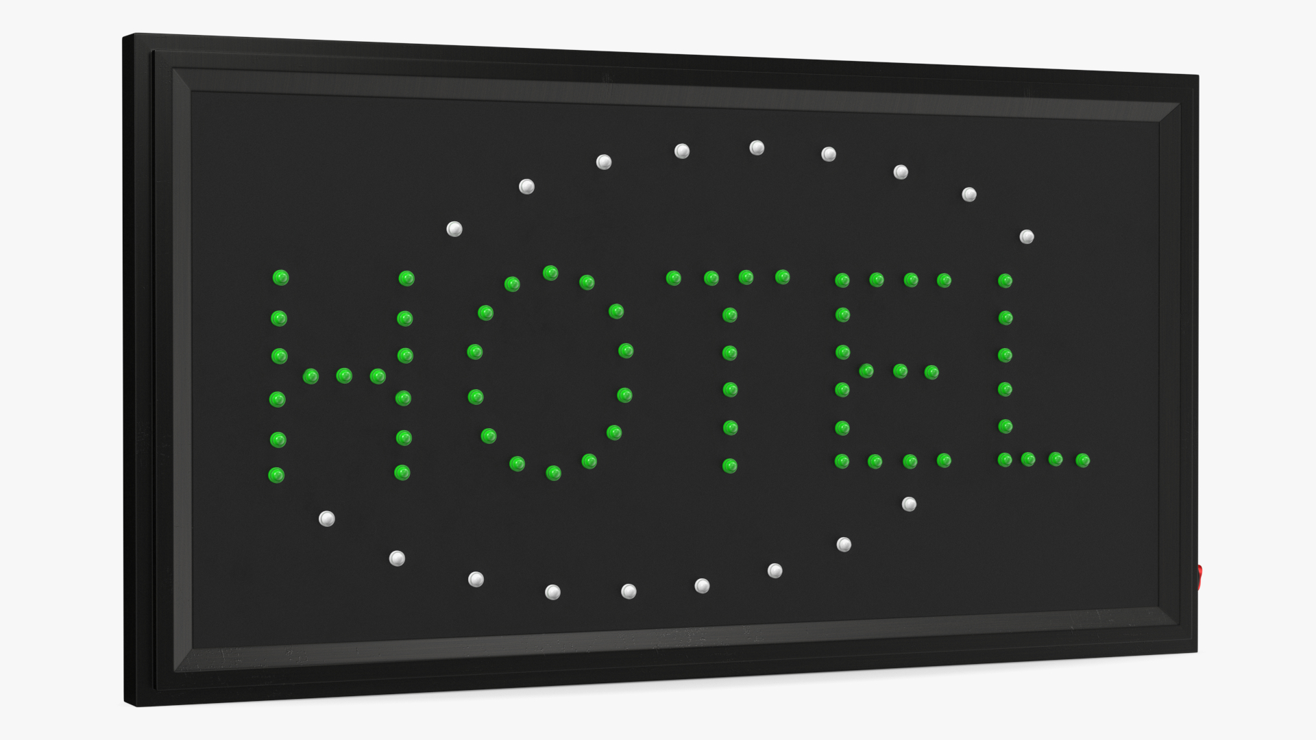 Green Hotel LED Neon Sign OFF is a 3D model of special programmable displaying signboard (retro style box shaped, rectangular, electronic LED sign panel), with advertising text which can be visible in the night time.
