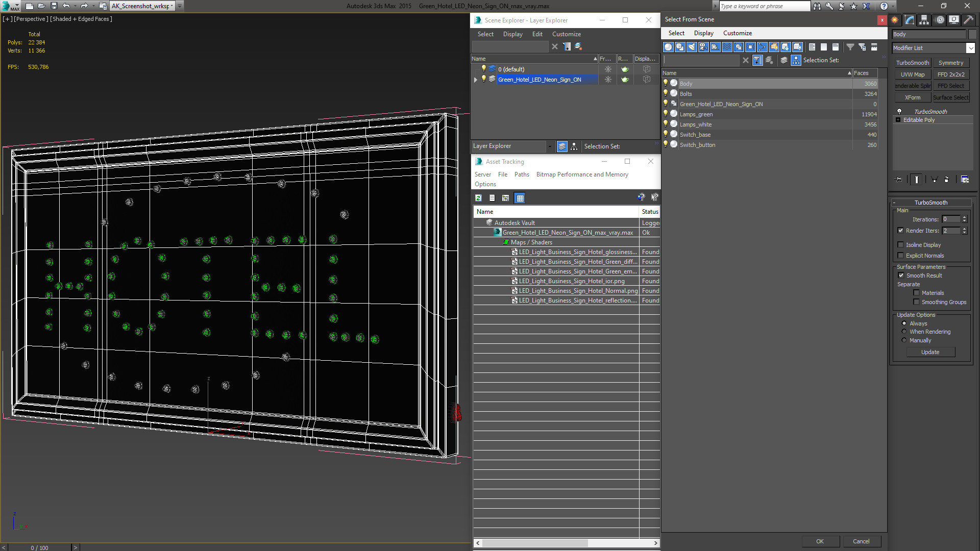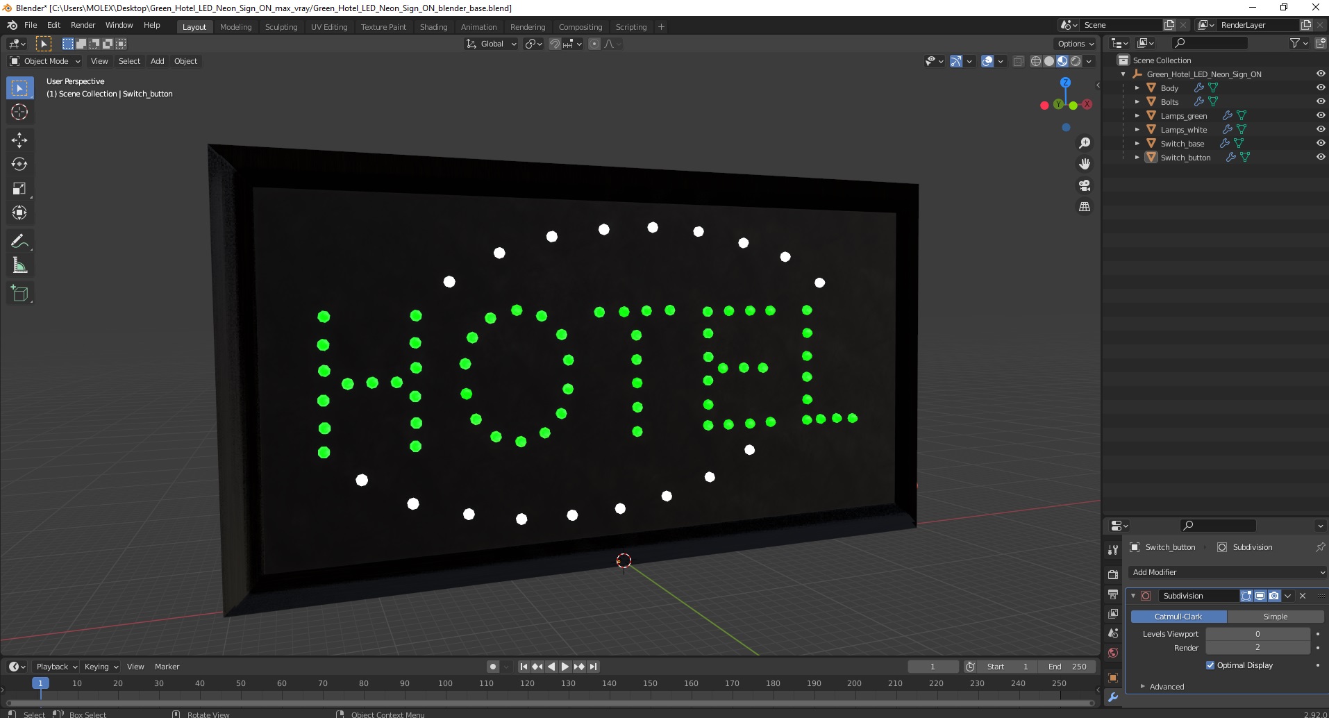 Green Hotel LED Neon Sign ON is a high quality, photo real 3d model that will enhance detail and realism to any of your rendering projects. The model has a fully textured, detailed design that allows for close-up renders, and was originally modeled in 3ds Max 2020 and rendered with V-Ray. Renders have no postprocessing!