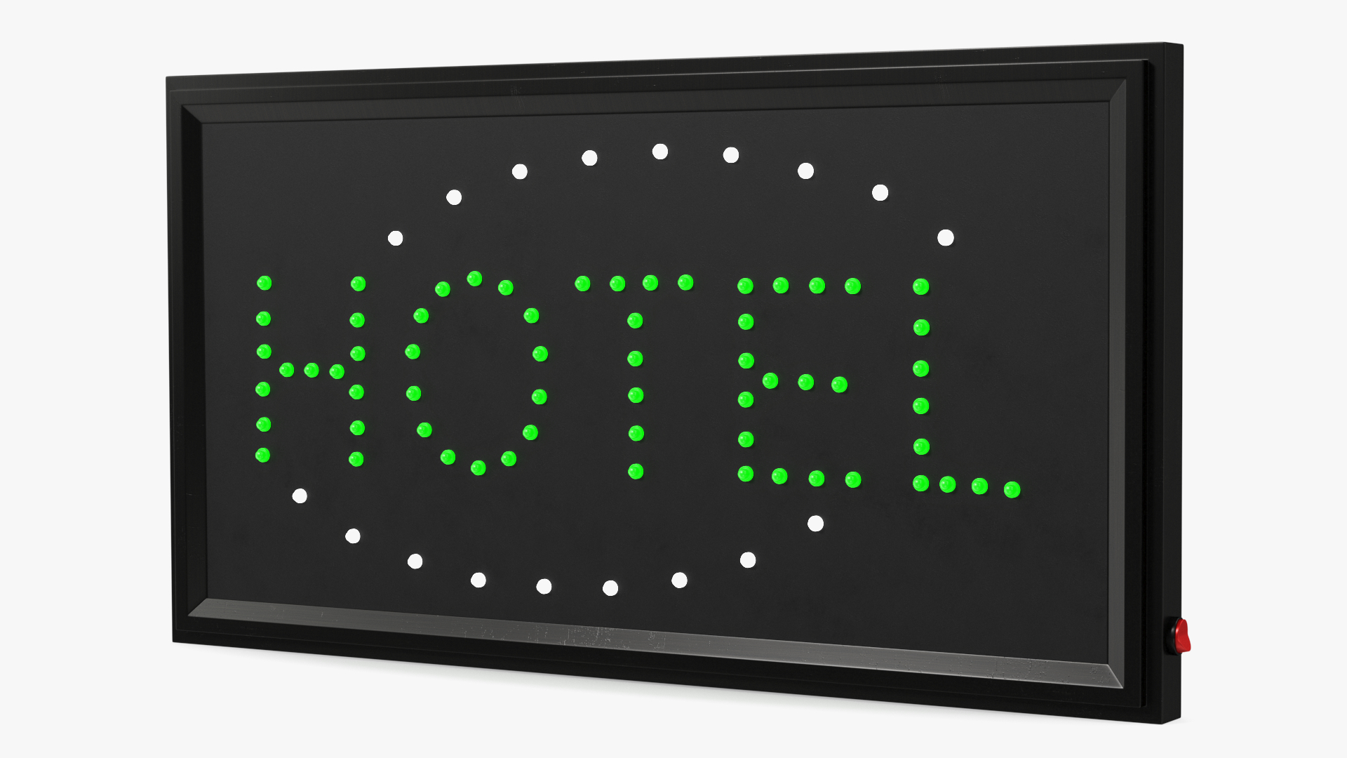 Green Hotel LED Neon Sign ON is a 3D model of programmable displaying signboard (special box shaped electronic LED type sign panel), with text which can be visible in the night time.
