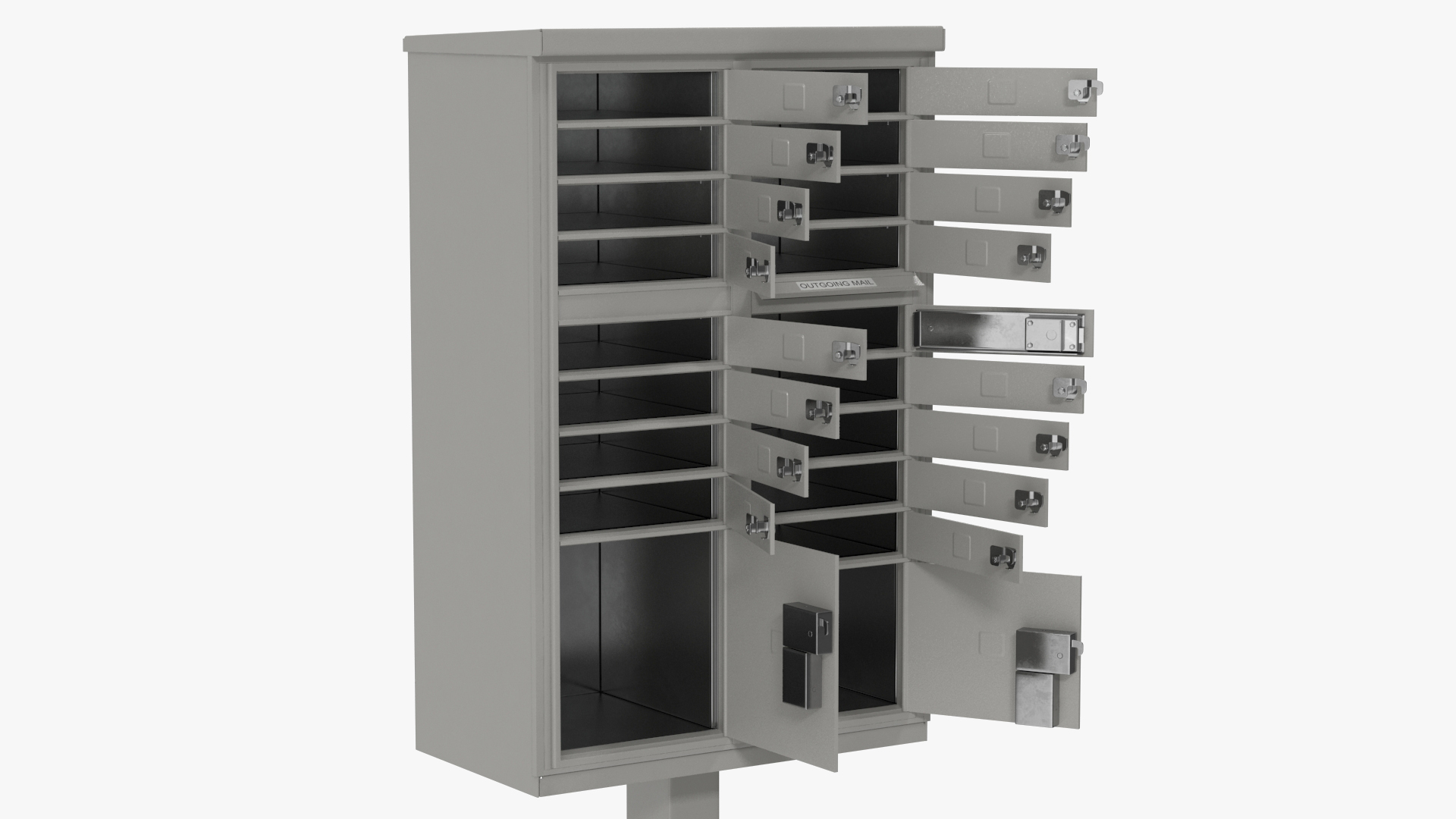 Grey Sixteen Door Parcel Cluster Mailbox is a three-dimensional model of outdoor (roadside, public space, curbside, or street) package drop box which is a metal container with pole type pedestal (letter deposit station).