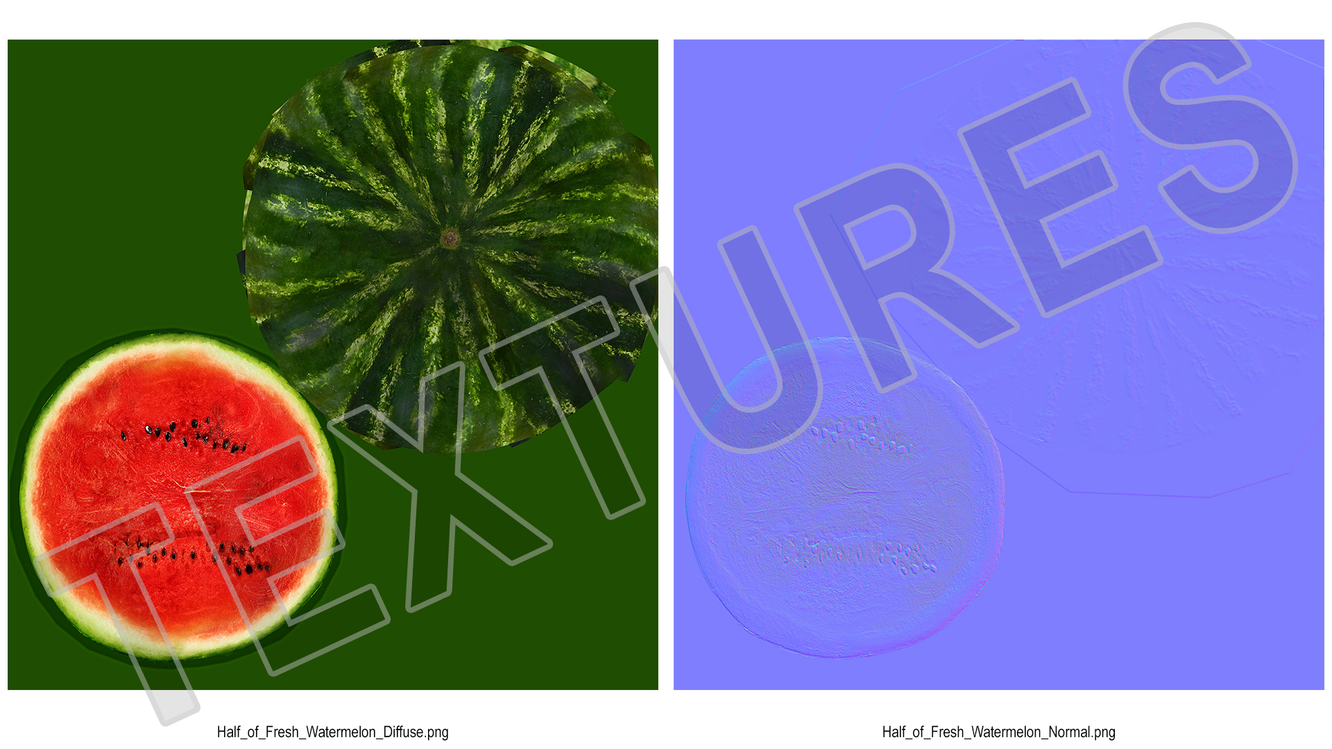 Half of Fresh Watermelon is a 3d model of juicy fruit with a thick green rind and a sweet, red or pink flesh containing black seeds.