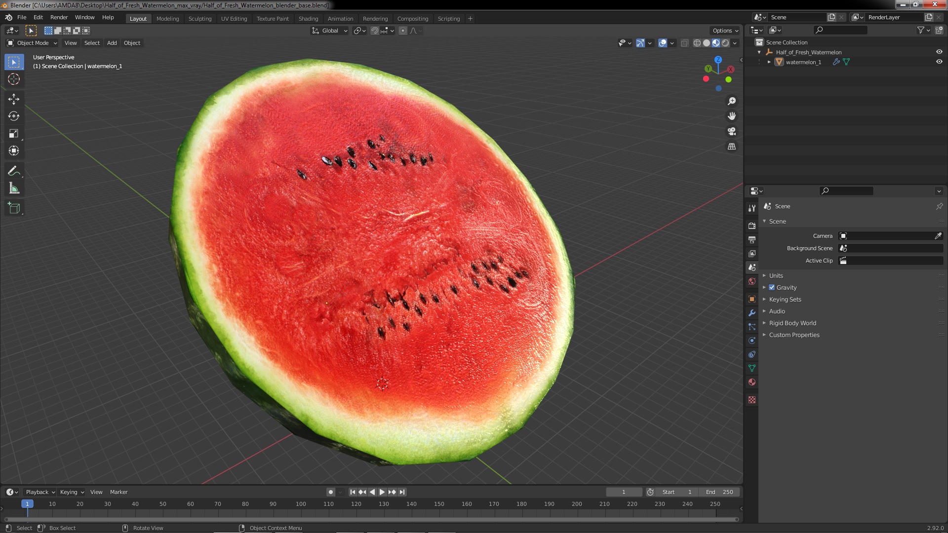 Half of Fresh Watermelon is a high quality, photo real 3d model that will enhance detail and realism to any of your rendering projects. The model has a fully textured, detailed design that allows for close-up renders, and was originally modeled in 3ds Max 2020 and rendered with V-Ray. Renders have no postprocessing!