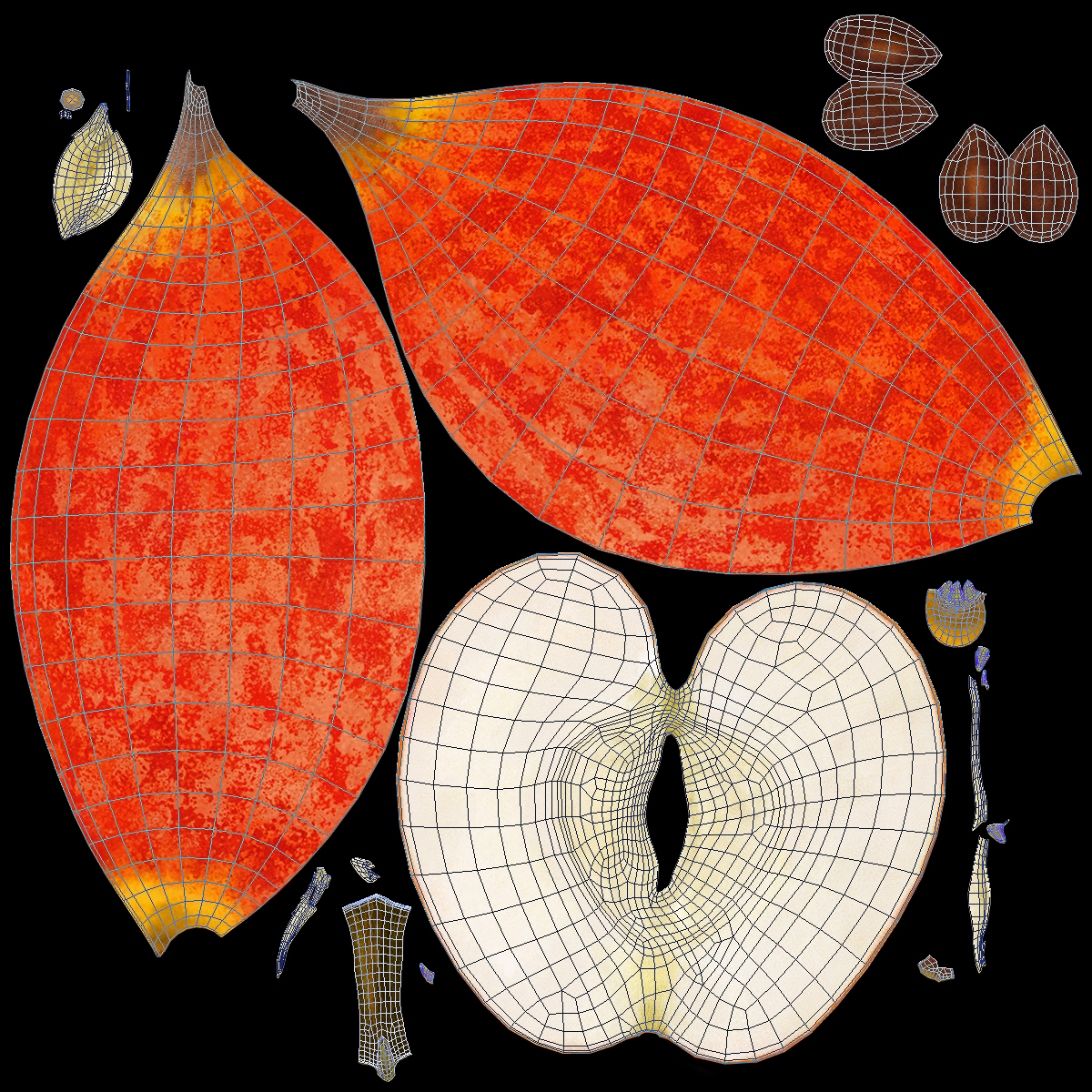 Half Sliced Apple is a three-dimensional model of common, well known, edible and dessert type fruit which is a widespread and popular vegetarian food.
