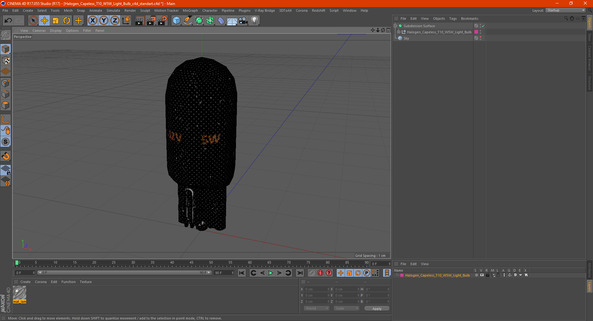 Halogen Capeless T10 W5W Light Bulb is a high quality, photo real 3d model that will enhance detail and realism to any of your rendering projects. The model has a fully textured, detailed design that allows for close-up renders, and was originally modeled in 3ds Max 2020 and rendered with V-Ray. Renders have no postprocessing!