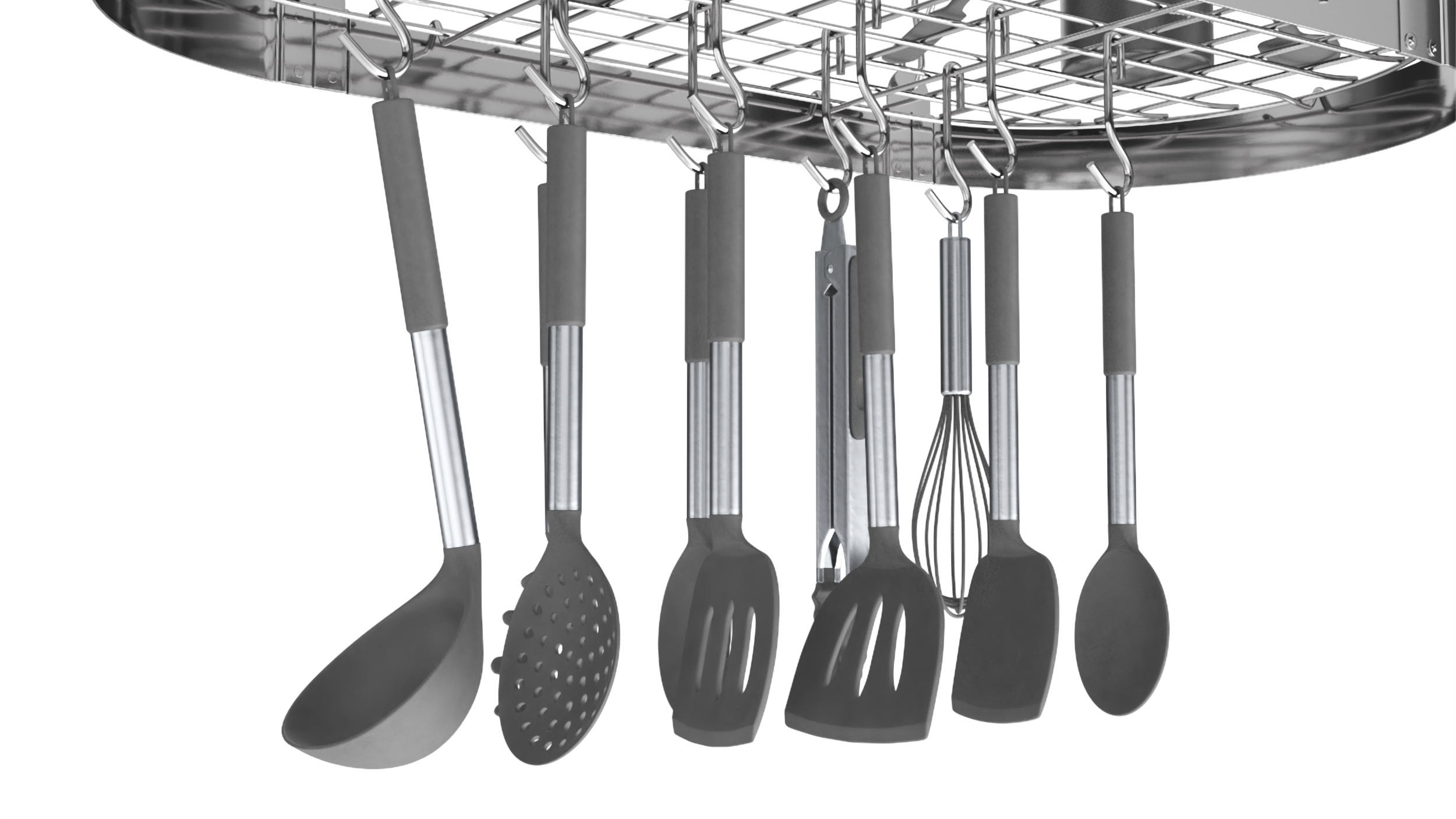 Hanging Pot Rack with Cooking Utensils is a three-dimensional model of set of special cooking tools in the kitchen ceiling mounted rack, which is a hanging tray type holder (special shelves type storage) for cutlery, pots, pans and other utensils.
