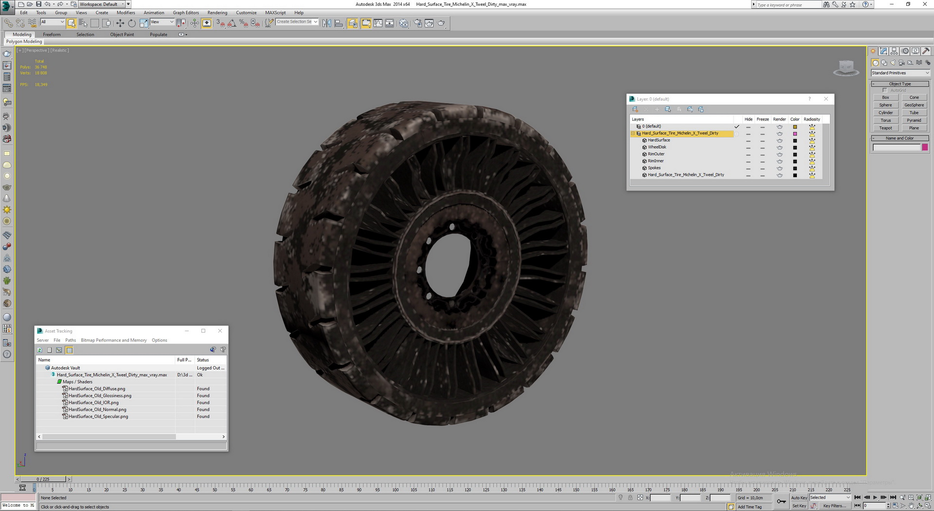 Hard Surface Tire Michelin X Tweel Dirty is a high quality, photo real 3d model that will enhance detail and realism to any of your rendering projects. The model has a fully textured, detailed design that allows for close-up renders, and was originally modeled in 3ds Max 2020 and rendered with V-Ray. Renders have no postprocessing!