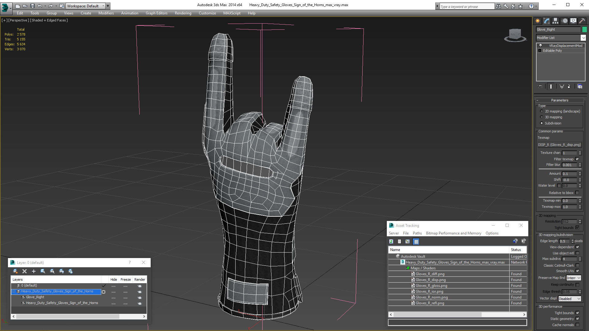 Heavy Duty Safety Gloves Sign of the Horns is a high quality, photo real 3d model that will enhance detail and realism to any of your rendering projects. The model has a fully textured, detailed design that allows for close-up renders, and was originally modeled in 3ds Max 2020 and rendered with V-Ray. Renders have no postprocessing!