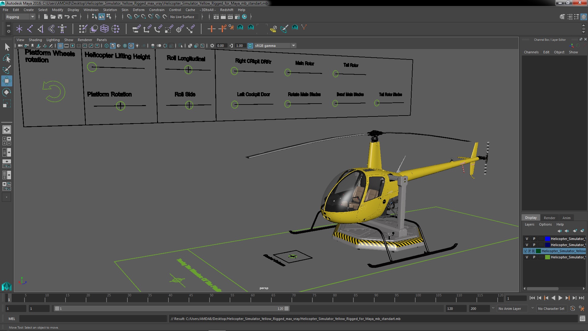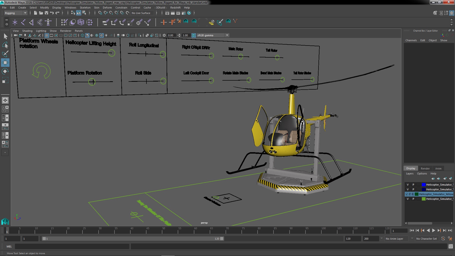 Helicopter Simulator Yellow Rigged for Maya is fully rigged and is ready to be animated in Maya. You can easily position it the way you need or animate it the way your project requires. See the screenshots to get an idea of how rigging works. The pose of the model on the render images is an example and can be recreated using rig, it is not initially included into the product.