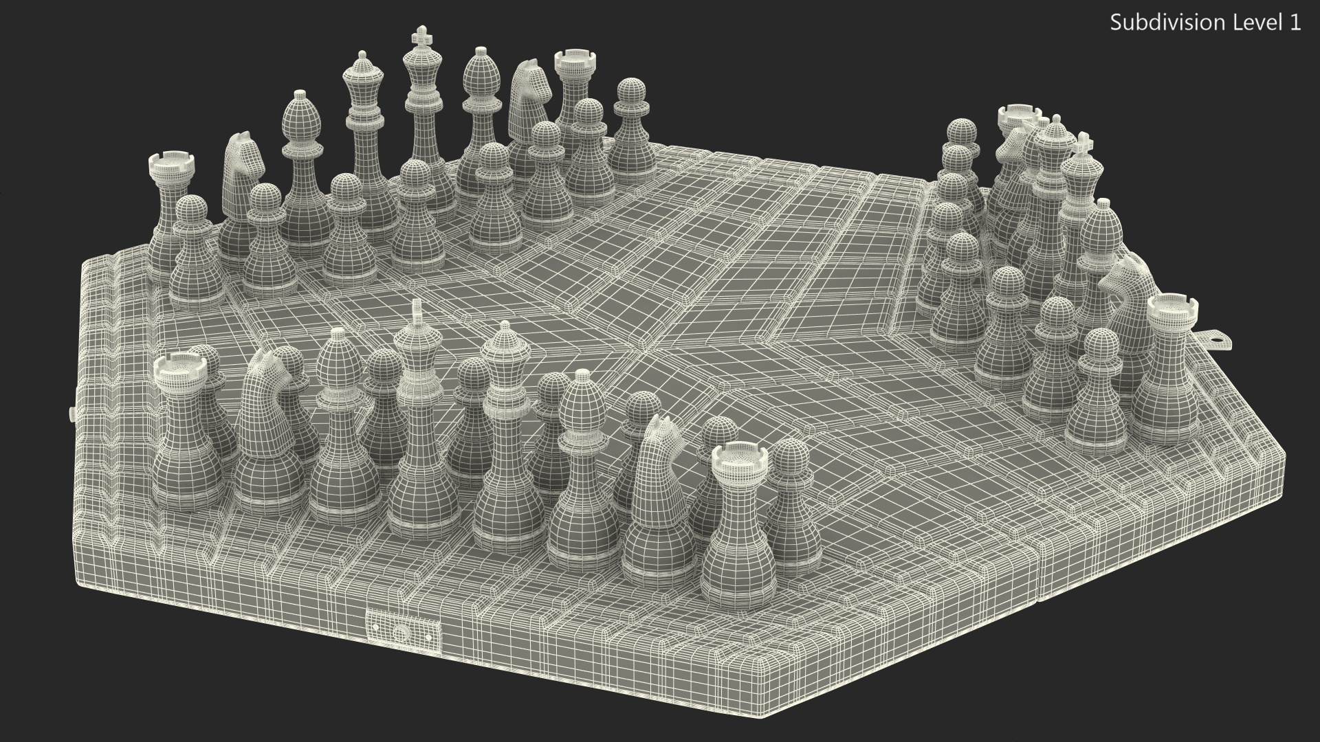 Hexagonal Chess for 3 Players is a high quality, photo real 3d model that will enhance detail and realism to any of your rendering projects. The model has a fully textured, detailed design that allows for close-up renders, and was originally modeled in 3ds Max 2020 and rendered with V-Ray. Renders have no postprocessing!