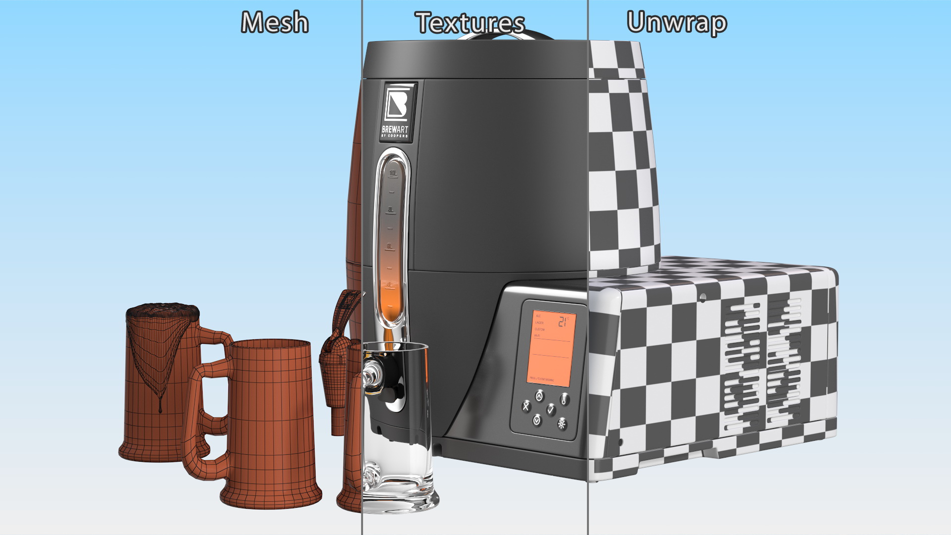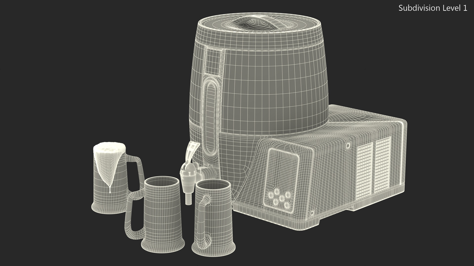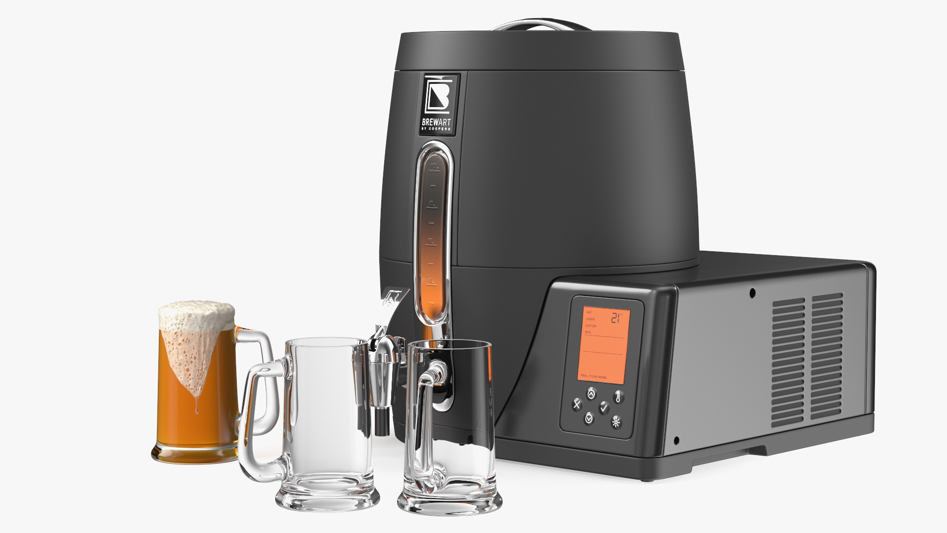 Home Beer Brewing Machine Brewart with Mugs is a 3d model of home beer brewing machine that allows individuals to brew their own beer at home.