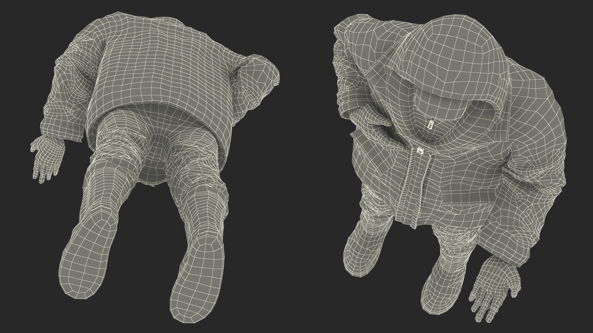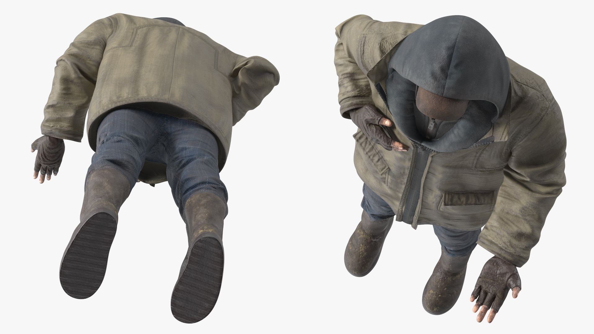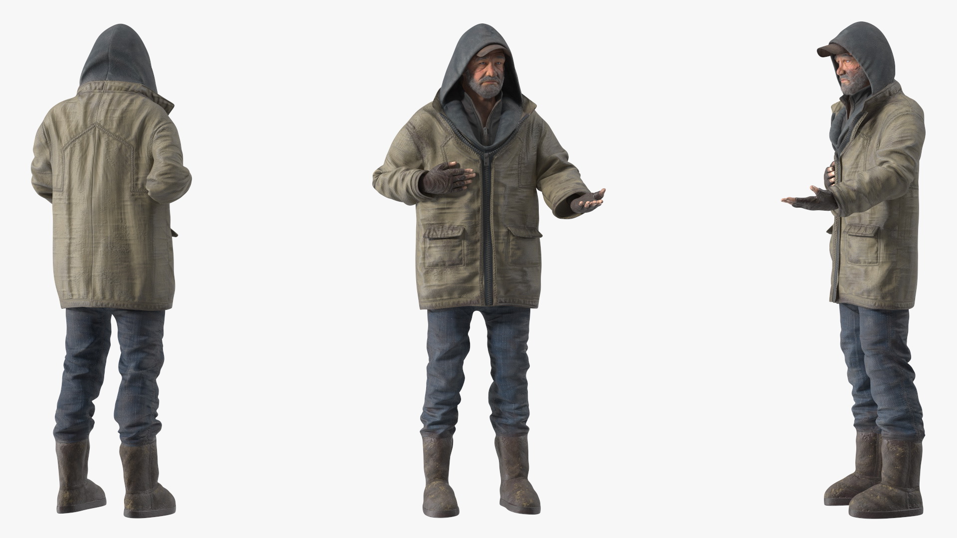 The model is intricately detailed, with the man's worn and layered clothing reflecting the harsh conditions of street life. His facial features and body language convey a deep sense of despair and pleading, making this model ideal for conveying emotional depth in various projects.