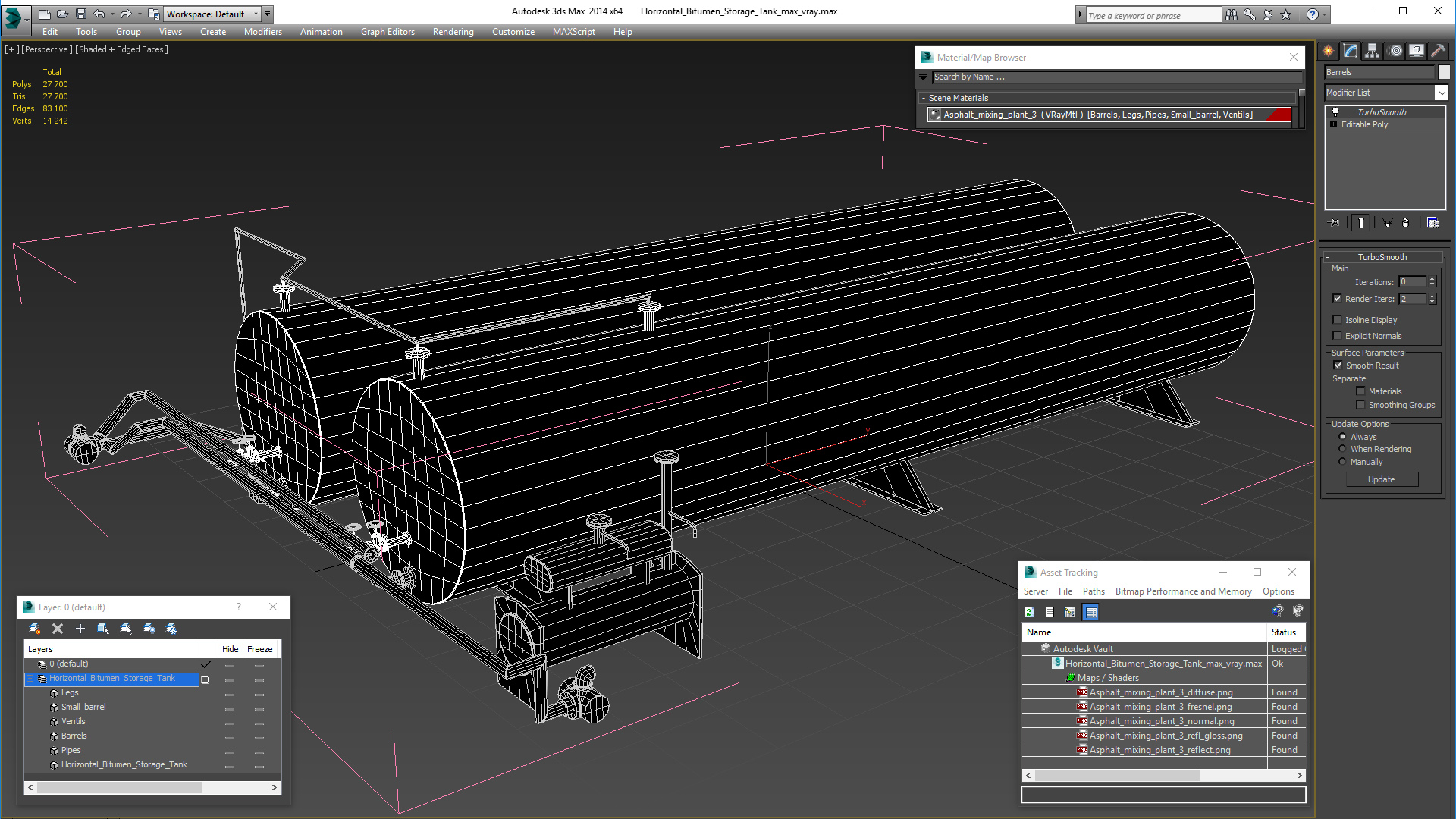 Horizontal Bitumen Storage Tank is a high quality, photo real 3d model that will enhance detail and realism to any of your rendering projects. The model has a fully textured, detailed design that allows for close-up renders, and was originally modeled in 3ds Max 2020 and rendered with V-Ray. Renders have no postprocessing!