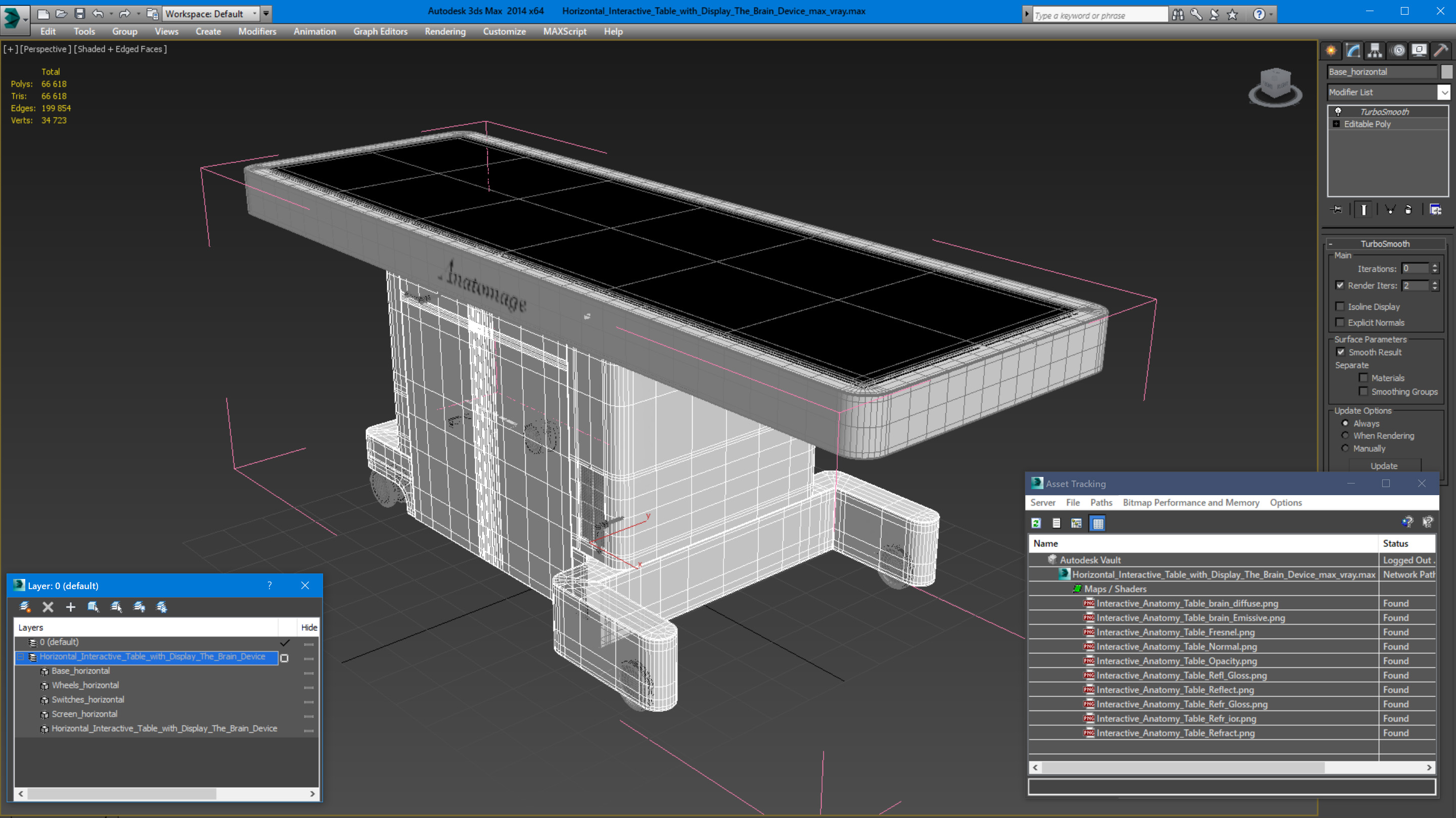 Horizontal Interactive Table with Display The Brain Device is a high quality, photo real 3d model that will enhance detail and realism to any of your rendering projects. The model has a fully textured, detailed design that allows for close-up renders, and was originally modeled in 3ds Max 2020 and rendered with V-Ray. Renders have no postprocessing!