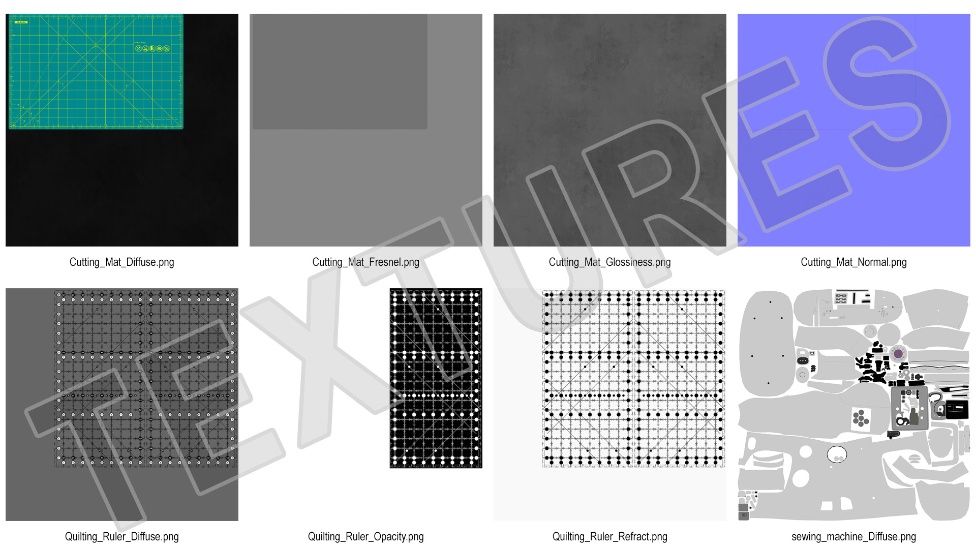 All textures and materials are included and mapped. (All colors can be easily modified.)