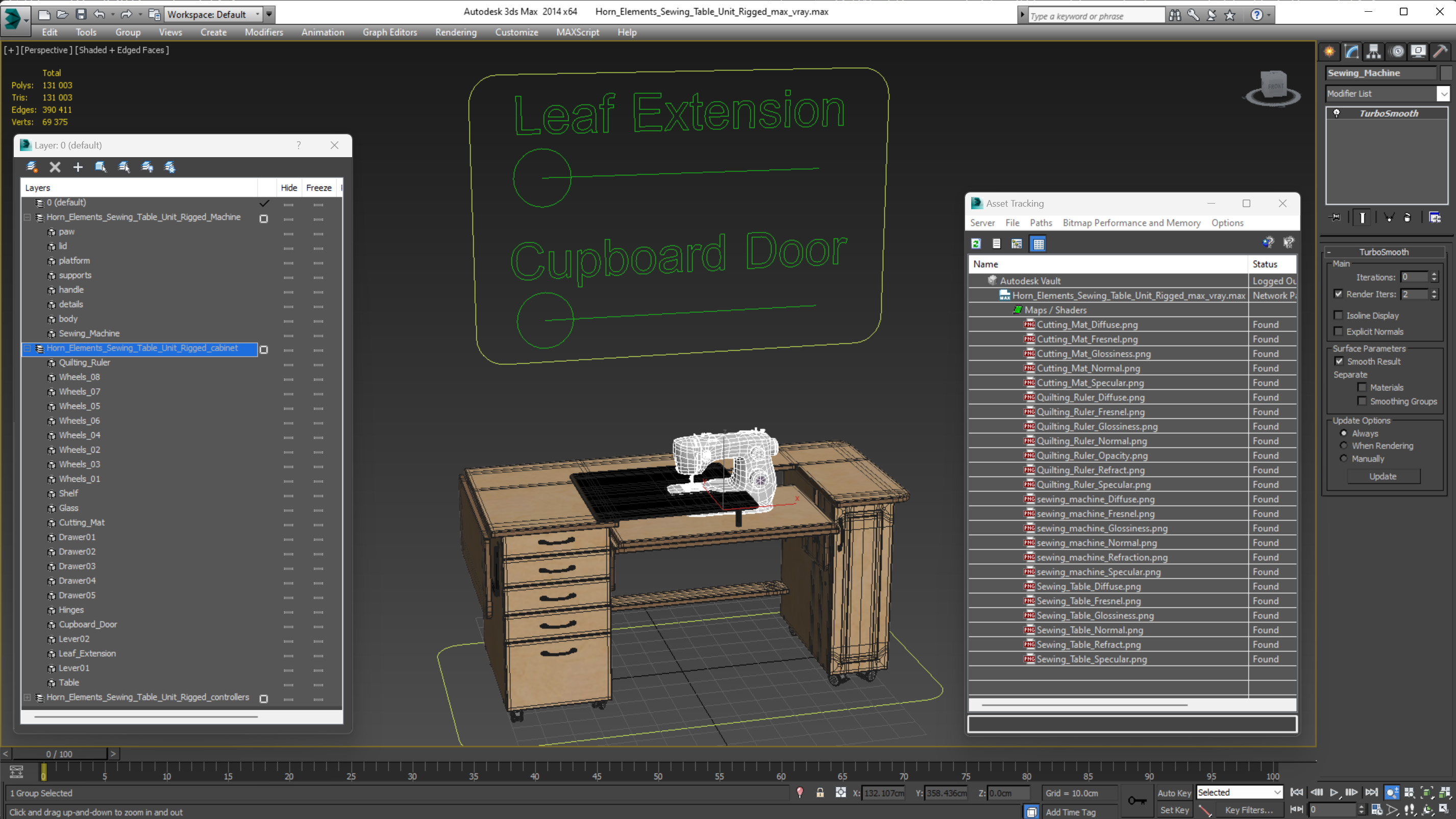 Horn Elements Sewing Table Unit Rigged is fully rigged and is ready to be animated. You can easily position it the way you need or animate it the way your project requires using helpers in 3D Studio Max. See the turntable to get an idea of how rigging works.