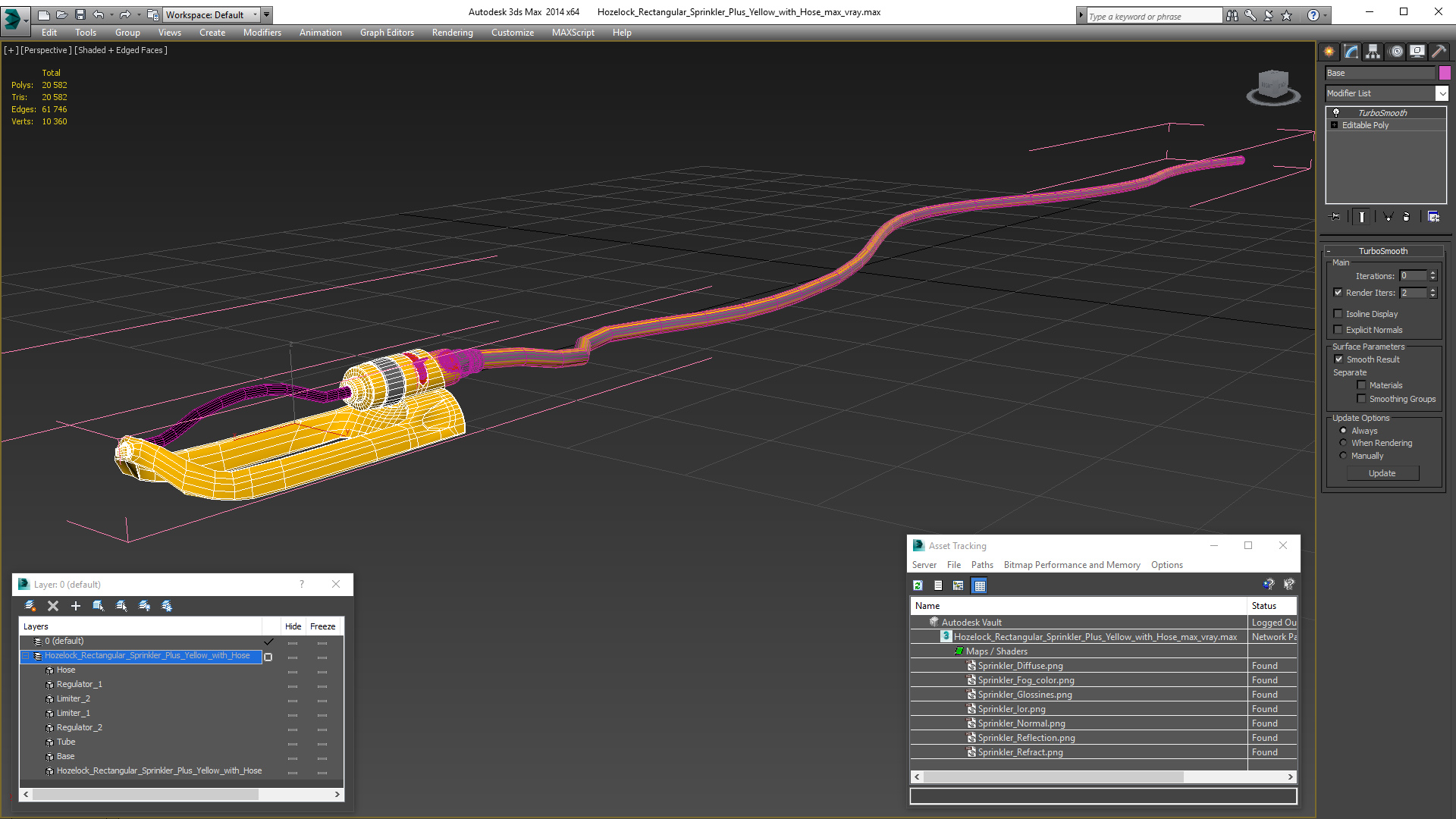 Hozelock Rectangular Sprinkler Plus Yellow with Hose is a three-dimensional model of a popular oscillating garden water sprayer which used to irrigate lawns, crops, garden plants and more.