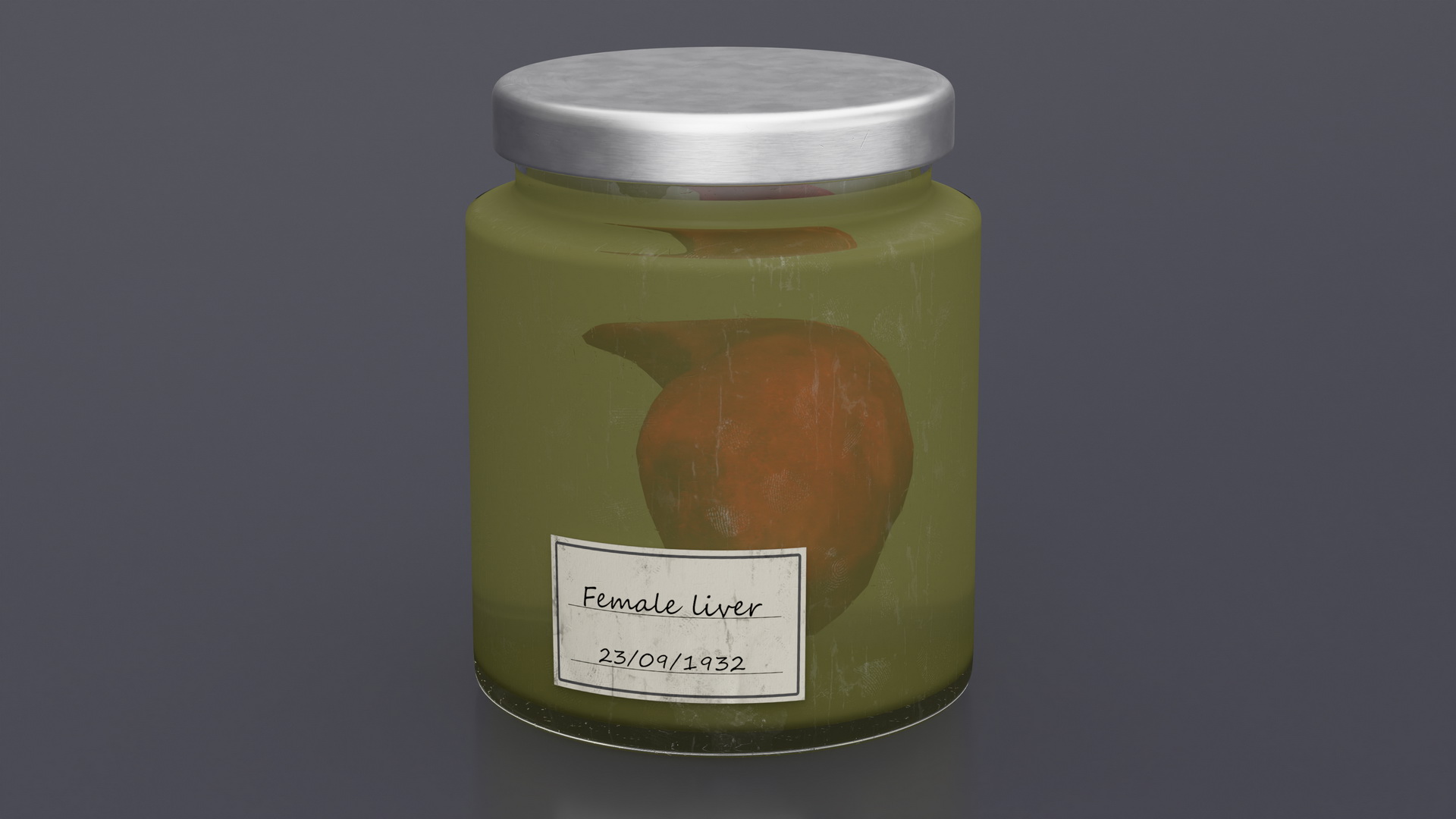 Human Liver Organ in a Jar is a three-dimensional model of human inner organ that is submerged in a preservation fluid, intended to halt decomposition and maintain its physiological state.