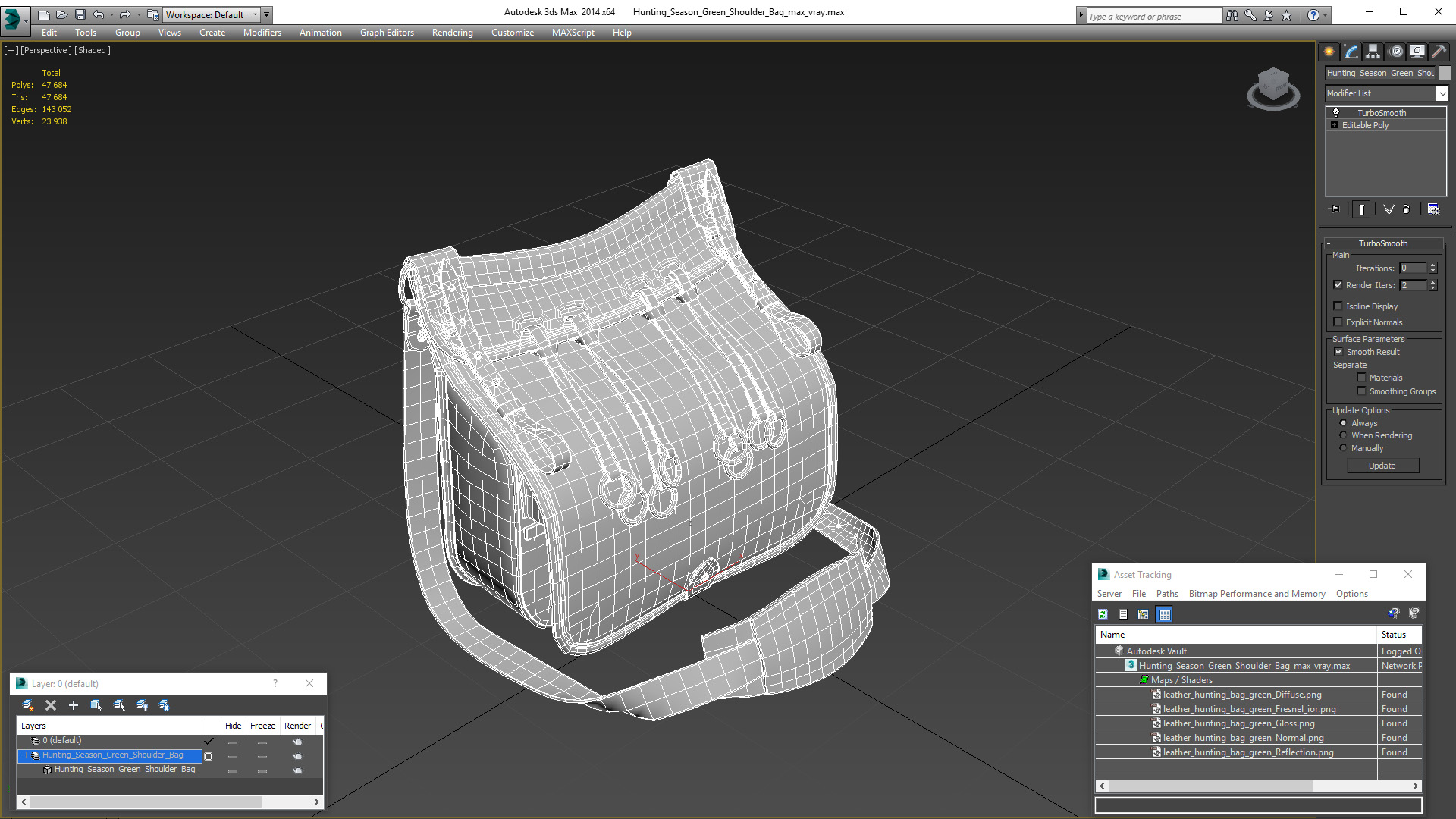 Hunting Season Green Shoulder Bag is a high quality, photo real 3d model that will enhance detail and realism to any of your rendering projects. The model has a fully textured, detailed design that allows for close-up renders, and was originally modeled in 3ds Max 2020 and rendered with V-Ray. Renders have no postprocessing!
